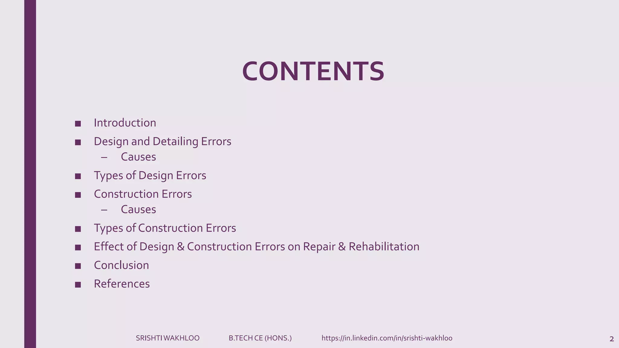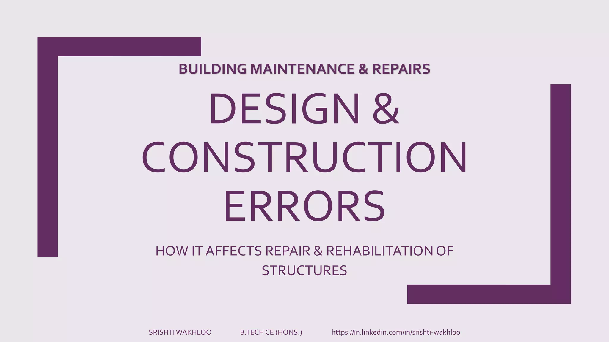 This document outlines design and construction errors in buildings and their impact on repair and rehabilitation. It categorizes errors, identifies their causes and effects, and discusses potential repair techniques to mitigate them. Key points include the importance of adherence to design specifications and proper construction practices to prevent costly repairs and structural failures.