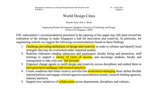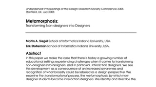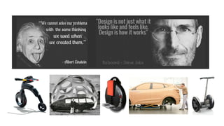 The document discusses creativity and design. It provides an overview of a course on creativity and design, including its objectives, themes, lessons learned from past years, and main changes for the upcoming year. The course aims to introduce basics of product design and examine issues relating to form, function, aesthetics and consumer experience. It discusses balancing content and keeping students outside their comfort zones. The document examines different views of design and provides examples of innovative designs. It emphasizes that creativity and design have strategic importance for organizations.