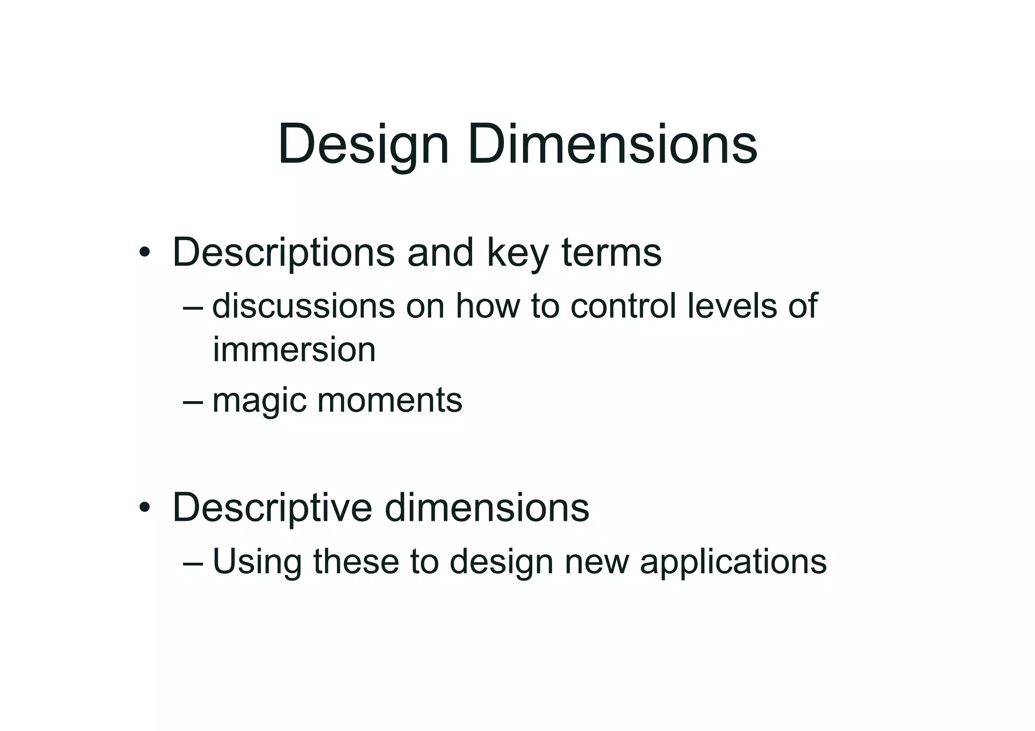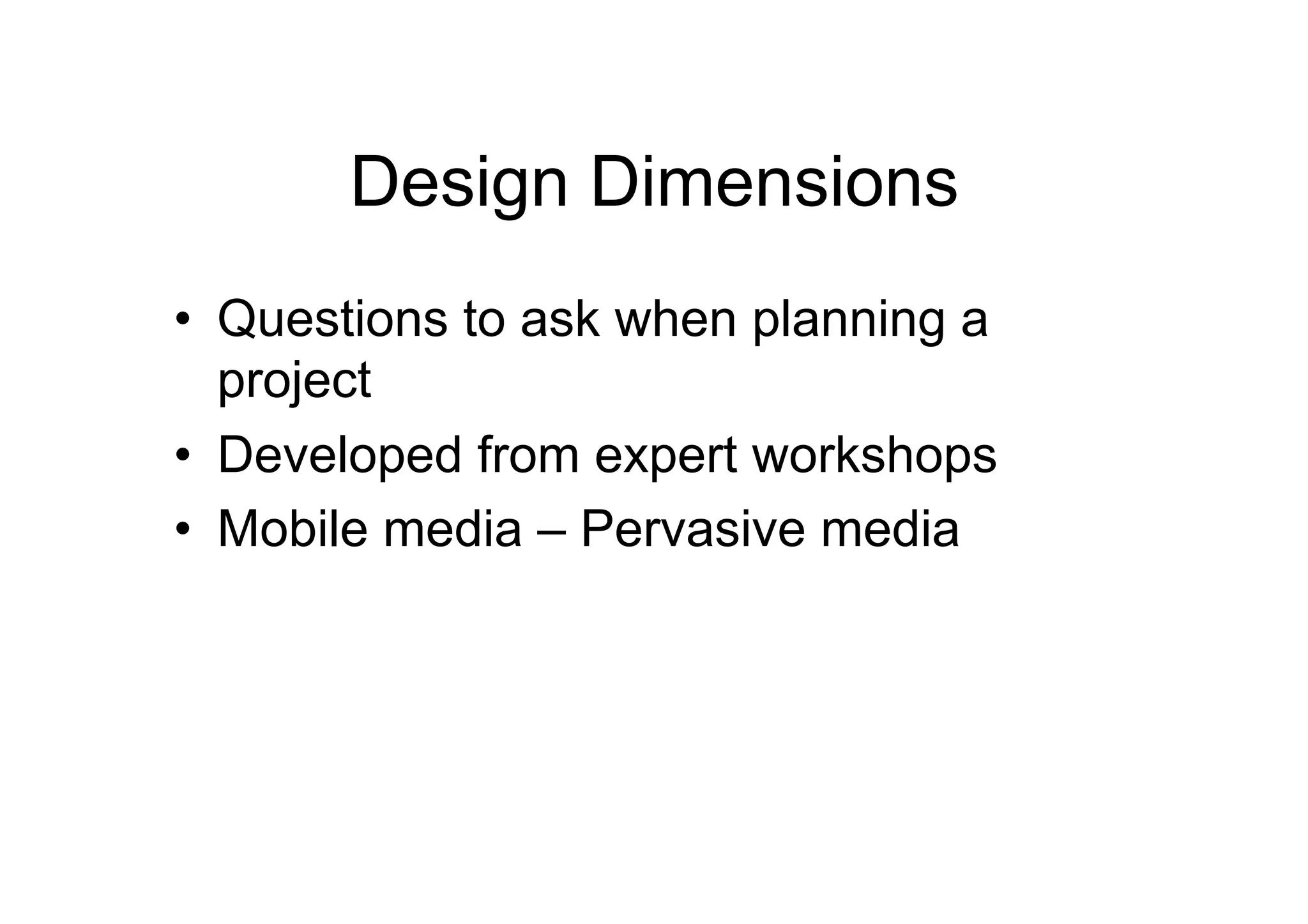 This document outlines descriptive dimensions for designing mobile media and pervasive media projects. It provides a template with 9 descriptive categories to characterize a project's activity, place, equipment, content, media mode, genre, affect, sociality, and skills. Descriptive dimensions are also defined that can be used to further describe a project, such as levels of immersion, user control, and relation to space/place.
