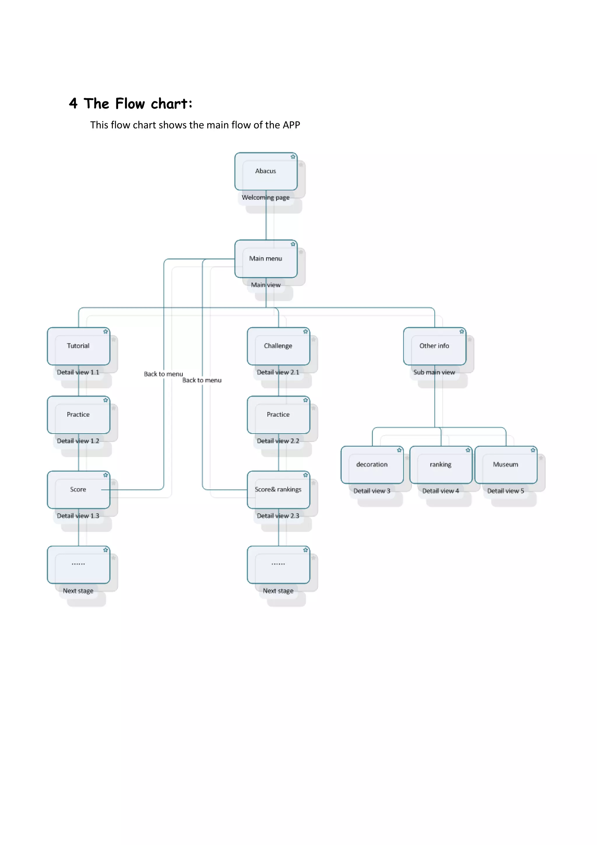 This document provides details on designing an app to teach users how to use an abacus. It outlines the structure and features of the app, including a tutorial mode to teach the basics of abacus use, a challenge mode with story problems to solve, and an "others" section for viewing information and rankings. Screenshots and descriptions are provided for the welcoming page, main view, teaching and challenge modes, others section, decorations, ranks, and a museum with abacus history. Design specifications cover the color scheme, buttons, icons, fonts, and flowchart. The goal is to create an educational yet fun app to teach the traditional Chinese abacus and its uses.