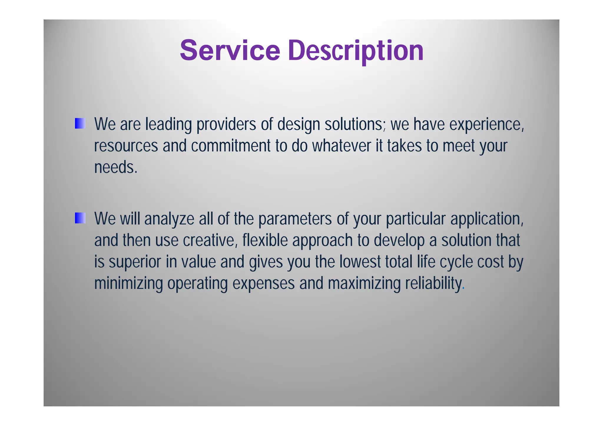 Service Description Weare leading providers of design solutions; we have experience, resources and commitment to do whatever it takes to meet your needs. We will analyze all of the parameters of your particular application, and then use creative, flexible approach to develop a solution that is superior in value and gives you the lowest total life cycle cost by minimizing operating expenses and maximizing reliability.