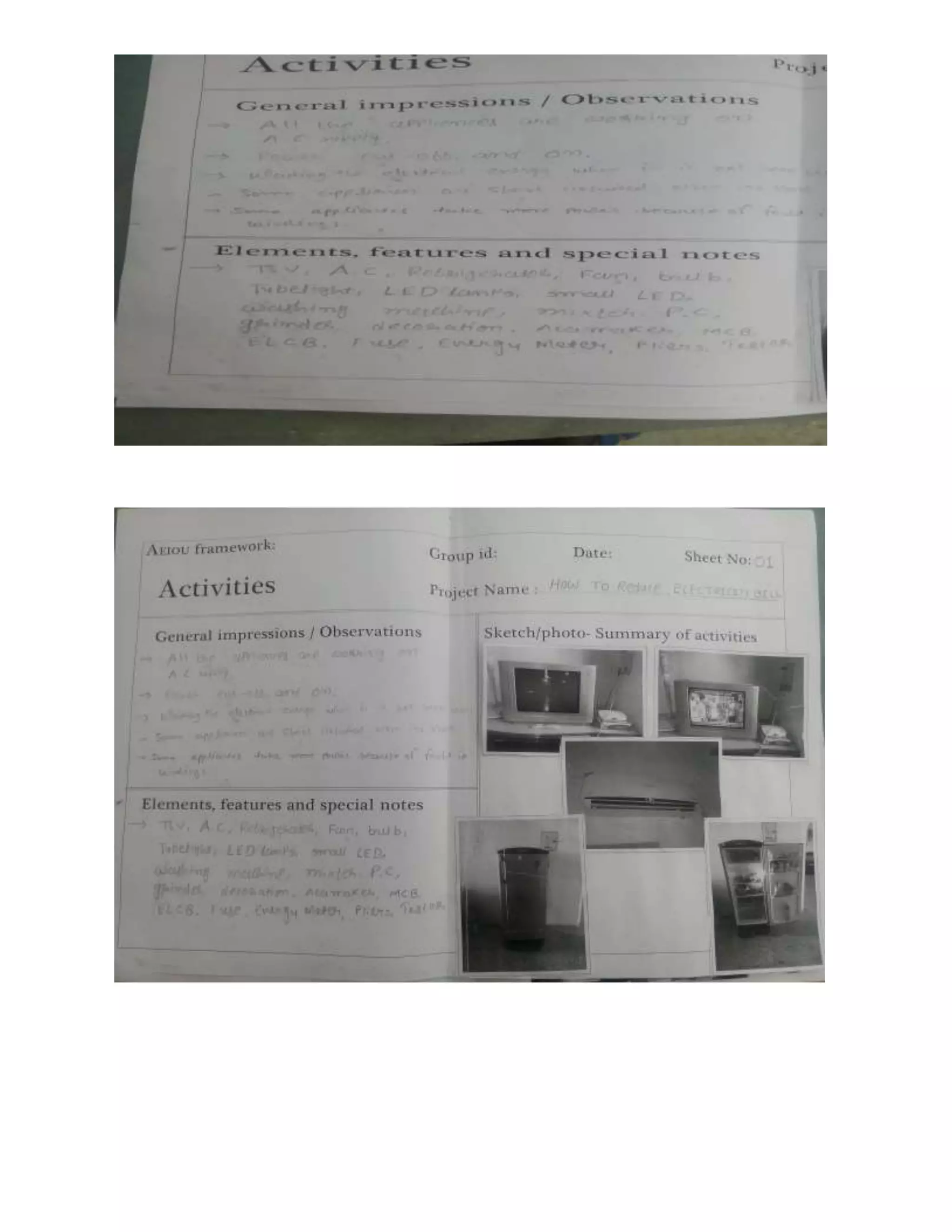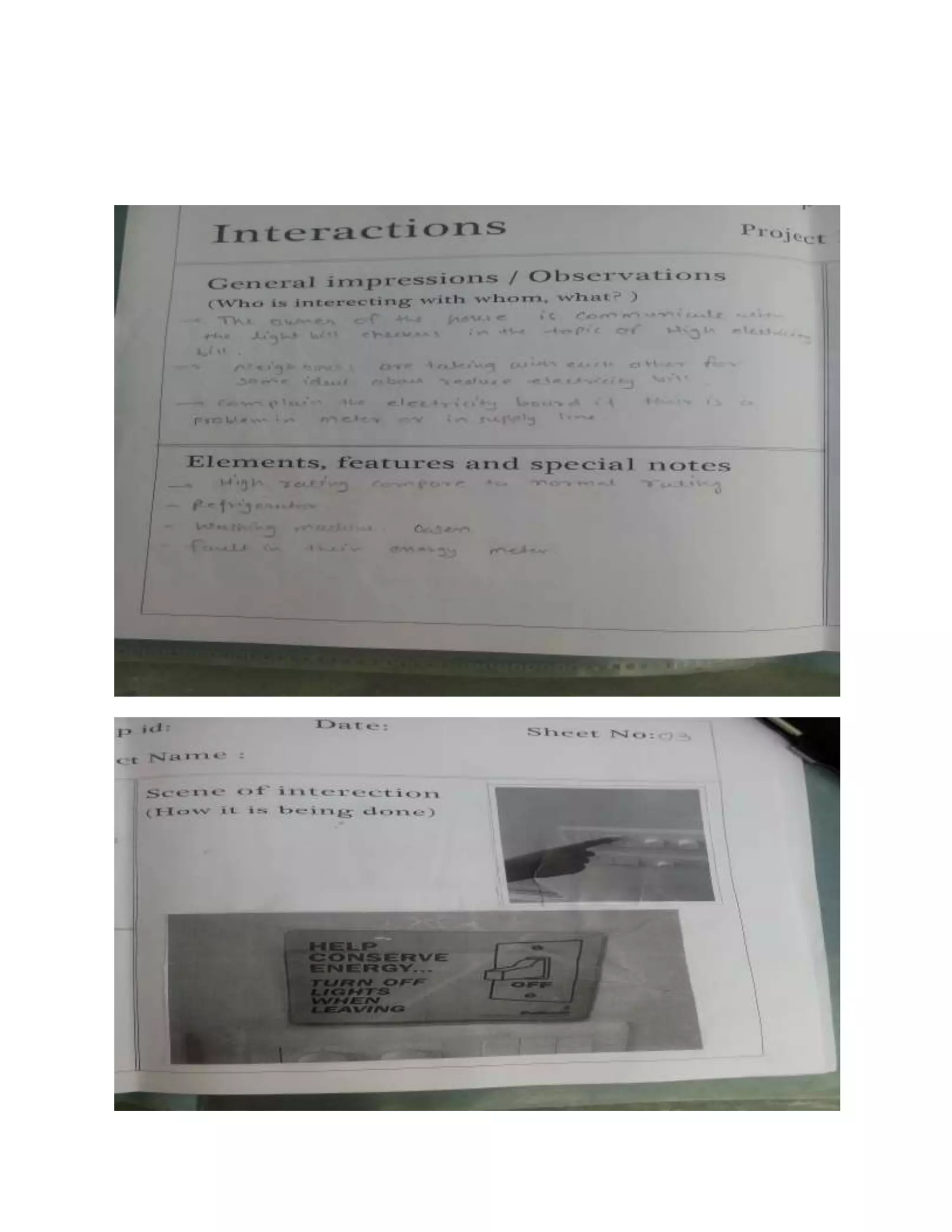This document is a project report submitted by a group of 4 students - Ravi Patel, Rai Narendra, Shah Viraj, and Sumara Anish - to their professor Sanjay Patel on reducing electricity bills. The report details the 5 required sheets for the project: A) Activity sheet, E) Environment sheet, I) Interaction sheet, O) Object sheet, and U) Users sheet. For each sheet, the report describes the observations and notes recorded by the group related to power consumption at their college laboratory and home appliances, with the goal of understanding how to reduce electricity bills.