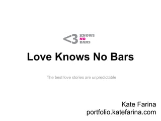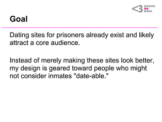 The document proposes a concept for a dating site called "Love Knows No Bars" that is designed for inmates but aims to attract a wider audience. It aims to minimize prejudice against inmates through an interactive introduction that does not initially reveal it is a site for inmates. The design uses a whimsical, non-threatening look to avoid instantly turning users off. It also aims to build user confidence through profile recommendations from friends or family of the inmate to provide more context for their character. While not all users will pursue inmate profiles, the goal is also to educate users about the prison system and encourage them to share the site.