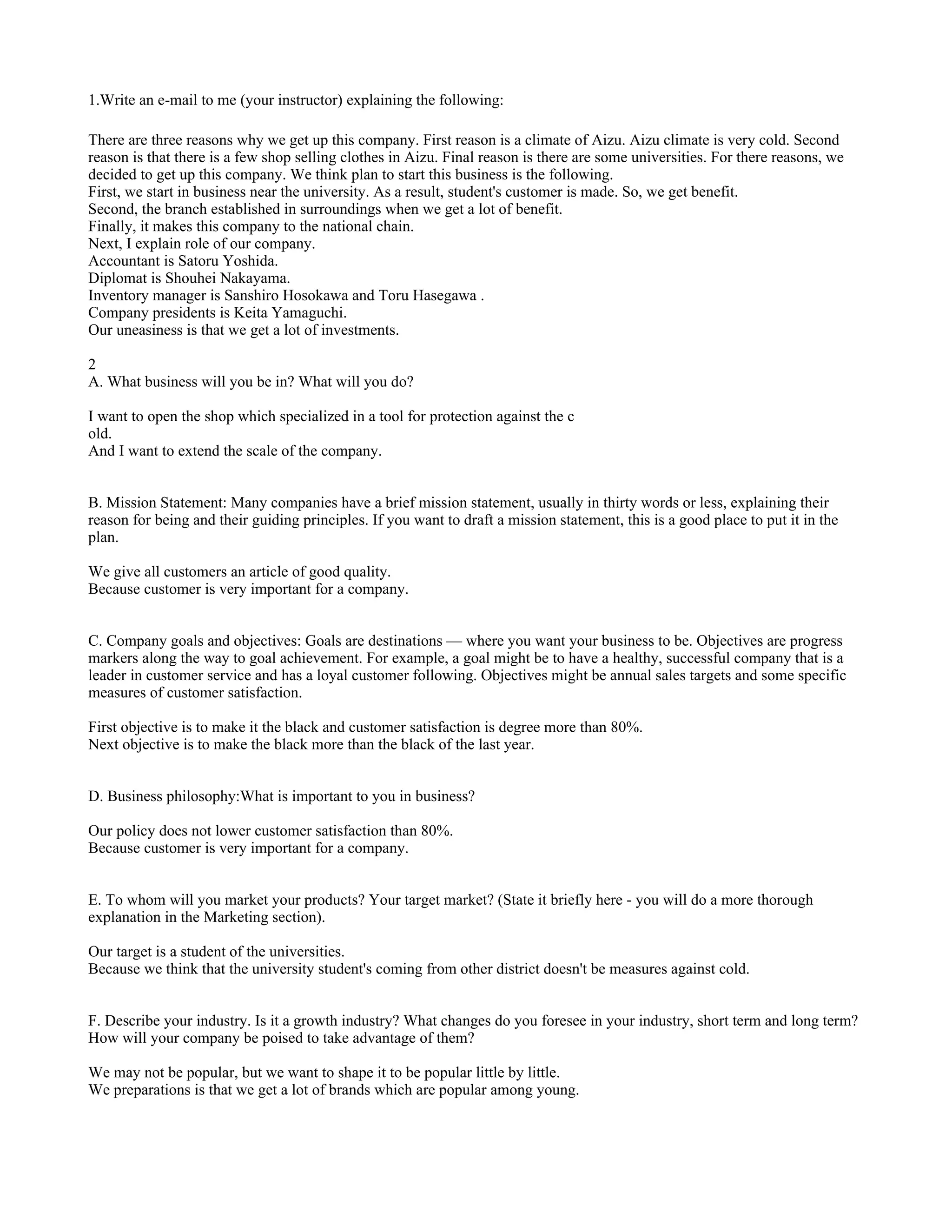 The document outlines a business plan for a clothing store in Aizu, Japan. The store will specialize in cold weather gear near local universities to target students. Key points include: