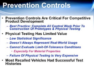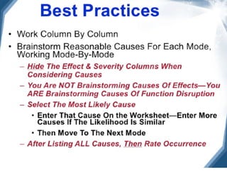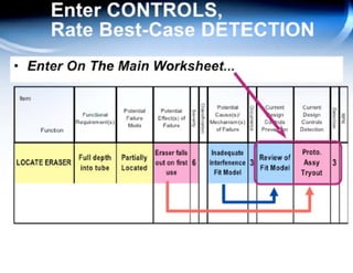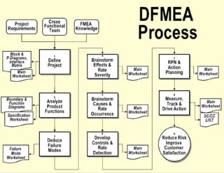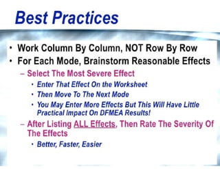 This document provides guidance on conducting a Design Failure Mode and Effects Analysis (DFMEA). It begins with defining the purpose of a FMEA and what it involves. It then discusses current DFMEA practices and concerns. The remainder of the document offers detailed instructions on performing a DFMEA, including how to construct a process flow diagram, interface matrix, evaluate potential failure modes and their effects/severity, occurrence, detection, and risk priority numbers. It provides examples and criteria for properly analyzing risk and prioritizing corrective actions. The overall summary is that the document aims to refine the approach to DFMEAs by outlining the full process and key considerations for effectively conducting a thorough design risk assessment.