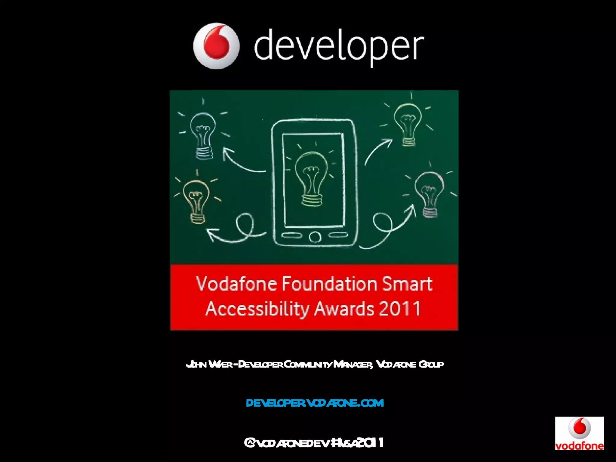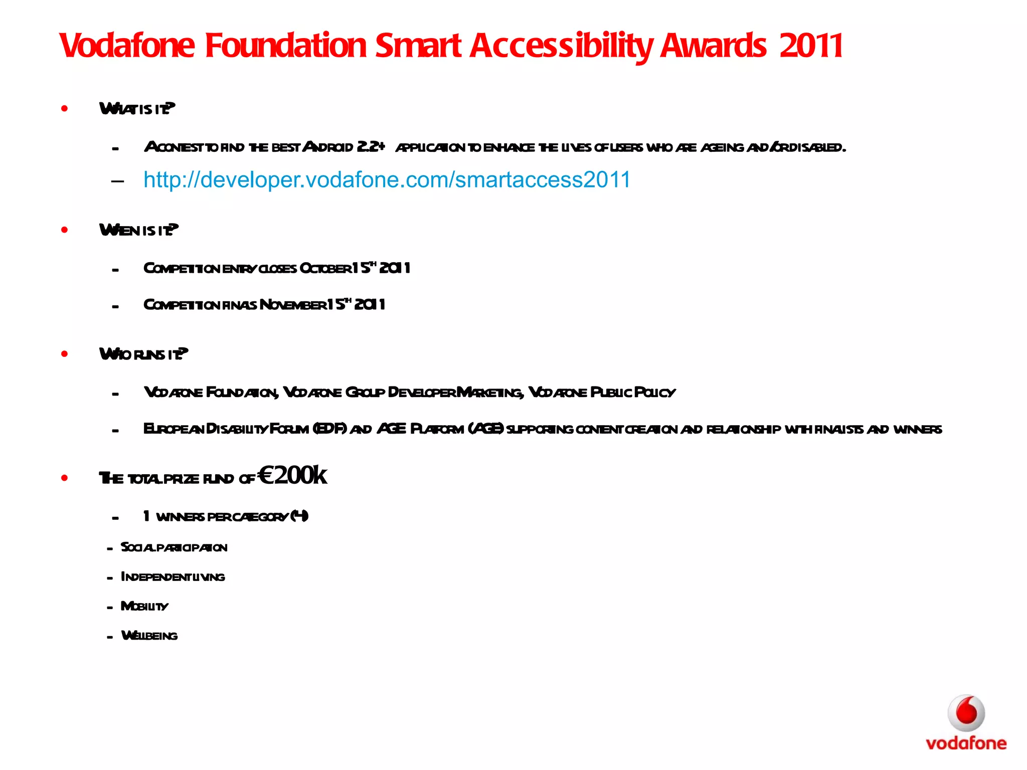 The document discusses the Vodafone Foundation Smart Accessibility Awards 2011, which is a contest to find the best Android application that enhances the lives of aging and disabled users. It provides details on the competition timeline and categories, selection process, resources for applicants, and contact information.