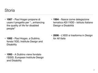 Il documento tratta del design for all, un approccio inclusivo che mira a garantire pari opportunità per tutte le persone, indipendentemente dalle loro abilità o necessità. Inizia con una storia del movimento, evidenziando come il design debba rispondere alla diversità umana attraverso l'accessibilità e la funzionalità. Il design for all si basa su un'analisi consapevole dei bisogni umani e coinvolge gli utenti finali in ogni fase del processo progettuale.