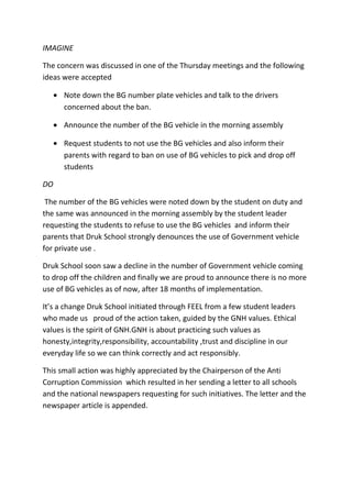 The document describes a contest held by Druk School in Bhutan to empower students to combat corruption. Some students were concerned about the high levels of corruption they observed. In particular, they noticed many government vehicles being used to transport children to and from school. The students decided to take action by noting license plate numbers of these vehicles and announcing them during morning assemblies, requesting students not use these vehicles and inform their parents of the school's policy. Over 18 months, this small action led to a decline and eventual stop of government vehicles being used privately. The Anti-Corruption Commission chair praised the initiative as an example for other schools to empower students to practice ethical values and combat corruption from a young age.