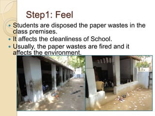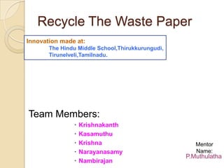 Students at The Hindu Middle School in Tirunelveli, Tamil Nadu collected paper waste from their classrooms to recycle into useful products instead of burning it. They made pen stands, paper weights, and dust pins from the recycled paper to improve school cleanliness and protect the environment by preventing paper burning. The recycled paper products were presented to teachers as examples of how waste can be reused productively.