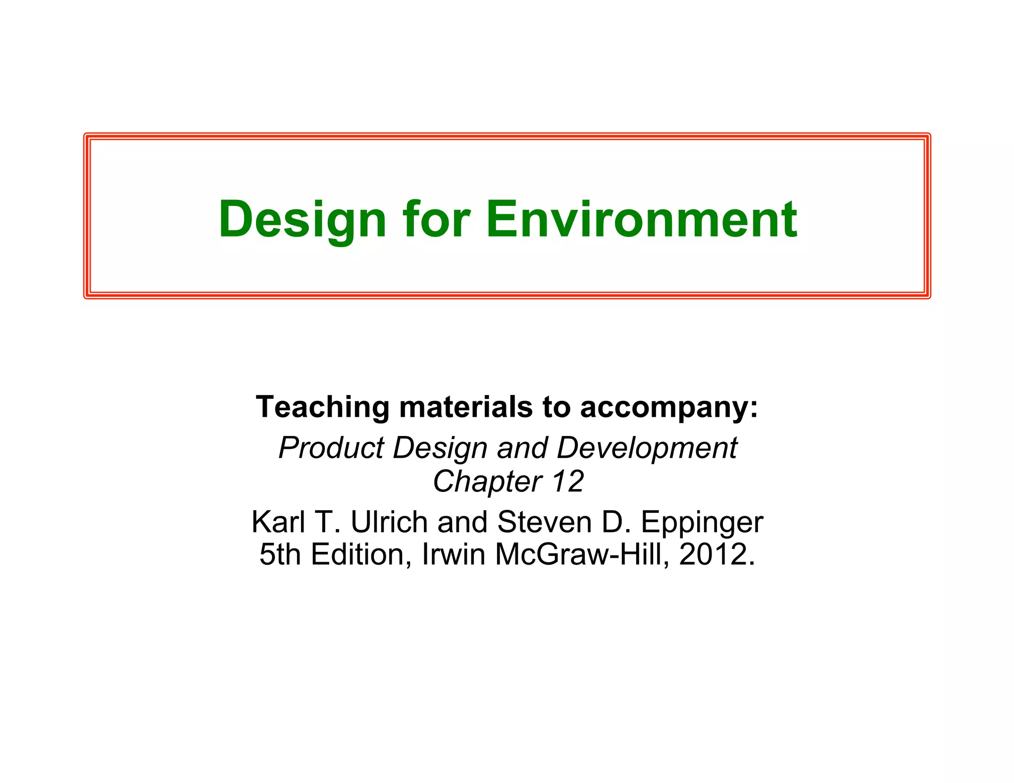 This document provides an overview of key concepts from Chapter 12 on Design for Environment from the textbook Product Design and Development by Karl T. Ulrich and Steven D. Eppinger. It discusses how design for environment (DFE) aims to minimize a product's environmental impact over its lifecycle. DFE expands the traditional focus on production to consider the entire closed-loop lifecycle. Methods like life-cycle assessment and cradle-to-cradle design are introduced. Examples of companies implementing DFE through use of recycled materials, design for disassembly, and other strategies are also provided.