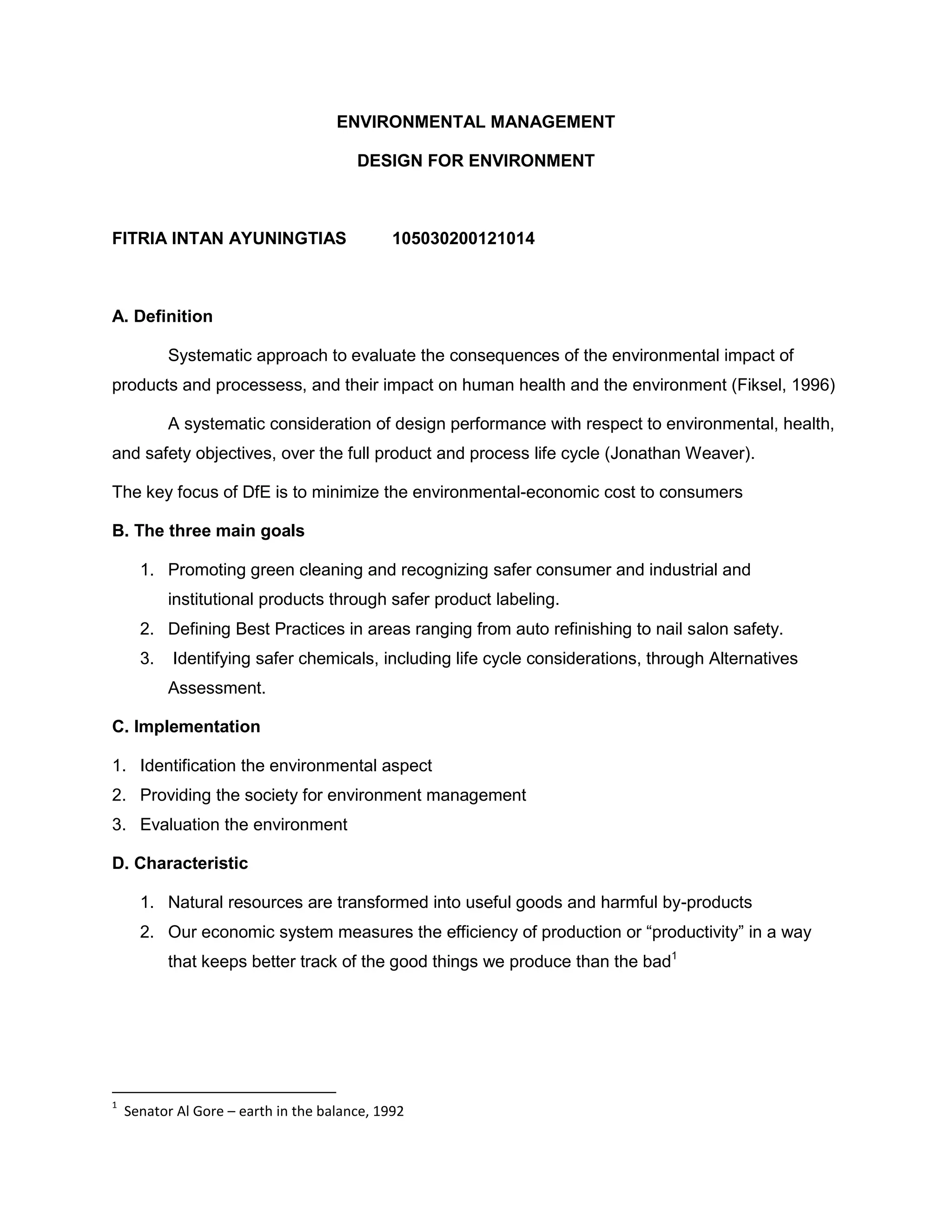 1. Design for environment (DfE) is a systematic approach to evaluate the environmental impacts of products and processes throughout their life cycles, with the goals of minimizing pollution and waste.