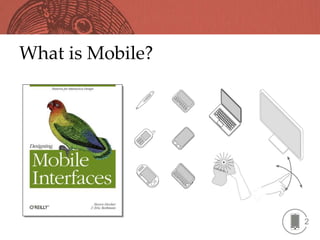 The document discusses designing interfaces for mobile experiences across different screens and platforms. It recommends taking a user-centered and service design approach to create a blueprint of the whole experience before designing interfaces for specific channels. The blueprint involves gathering information, defining personas and goals, listing all possible features, filtering to only necessary features, grouping by dependencies and priorities, and arranging notional interfaces. Interaction designs and interfaces can then be created for each channel by further filtering the blueprint and optimizing for interactions and interfaces on that platform. Communication and buy-in are also discussed as important to the design process.