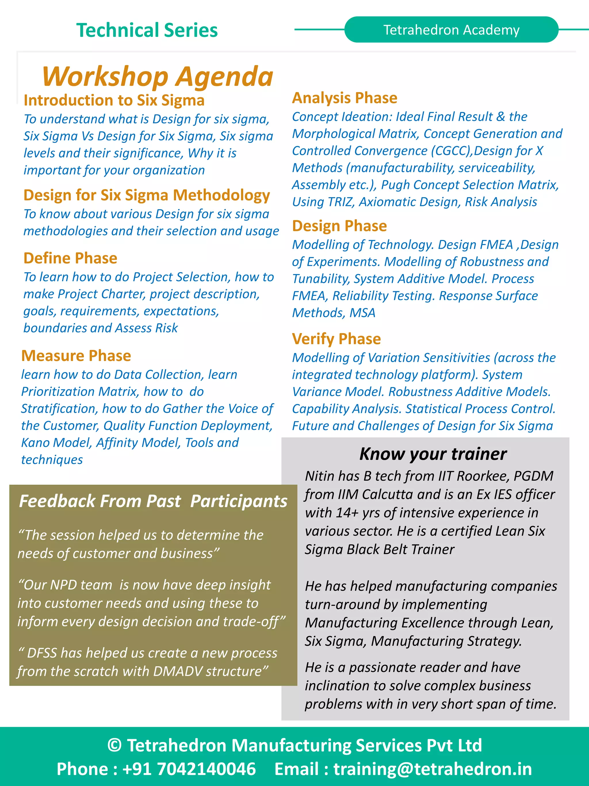 This document provides information on a 2-day Design for Six Sigma (DFSS) workshop. DFSS focuses on understanding customer and process needs to minimize redesign through critical parameter management. The workshop objectives are to design robust products and processes using DFSS methodology to meet Six Sigma performance levels and customer requirements. Benefits include reduced design complexity, improved quality, reduced time to market, and cost savings. The agenda covers DFSS phases and tools including define, measure, analysis, design, and verify.