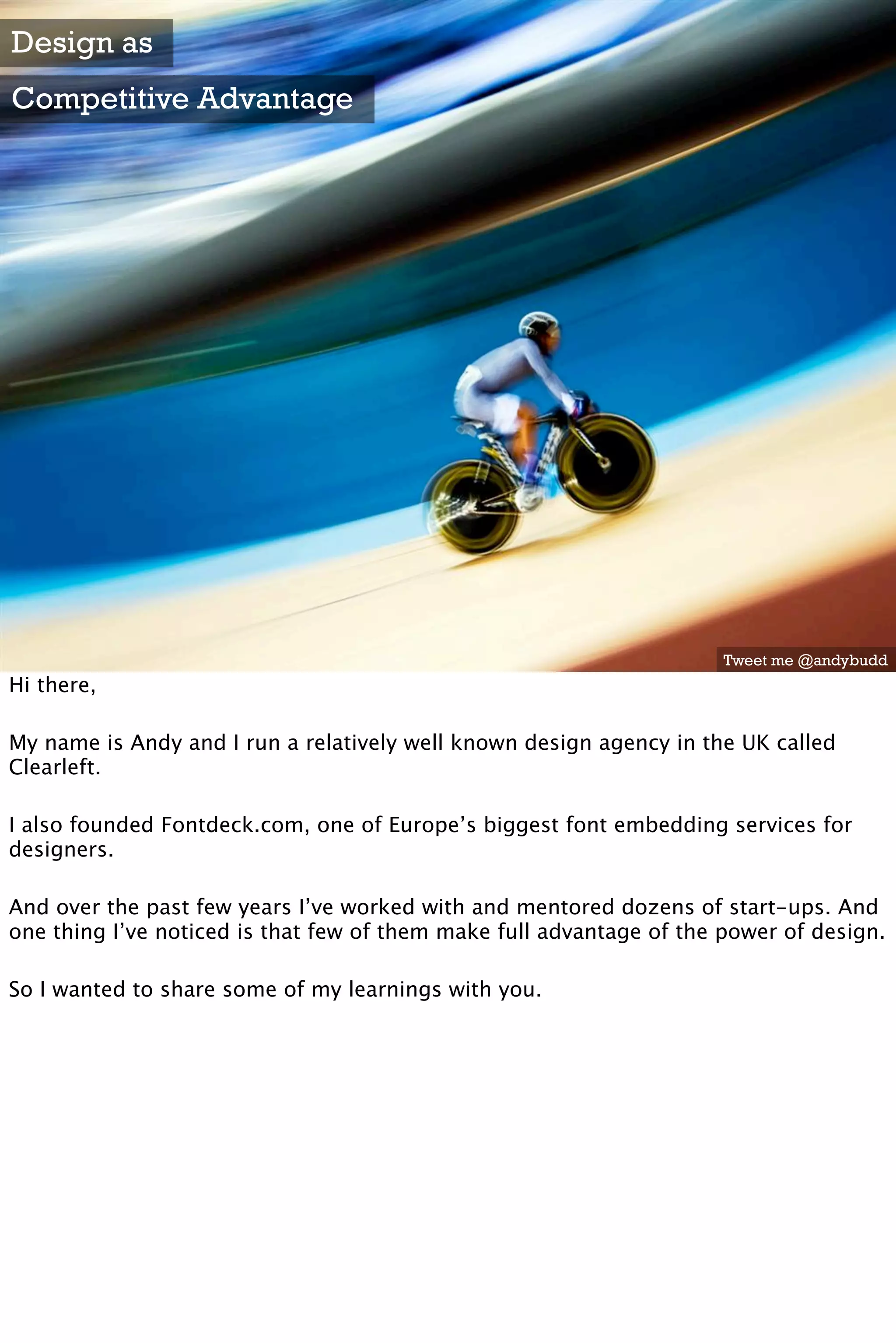 The document discusses how design can provide competitive advantage for startups. It argues that while early customers may accept utility over design, over time less forgiving users will notice problems like things being ugly, confusing or difficult to use. This can spell "game over" for growing companies. The document advocates hiring good designers and emphasizing user experience from the beginning to create products that are difficult for competitors to replicate and that people will love. It provides examples like Nest, MailChimp and Dropbox of companies that prioritized design.