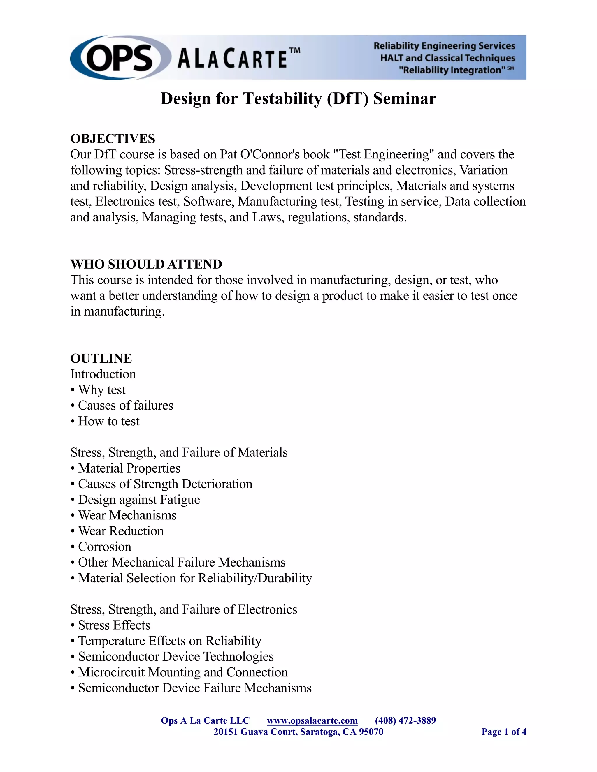 This seminar covers design for testability (DfT) principles based on a textbook. It is intended for those involved in manufacturing, design, or testing who want to learn how to design products for easier testing. The seminar covers topics like stress and failure analysis, variation and reliability, design analysis, development testing, manufacturing testing, software testing, and data analysis. It aims to teach participants how to design products that withstand stresses, have reliable electronics and materials, can be easily tested at different stages, and provide useful test data.