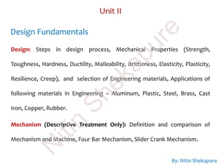 The document covers the fundamentals of mechanical engineering design, detailing the design process, materials selection, and mechanical properties such as strength, toughness, and elasticity. It emphasizes the importance of ergonomics and user comfort in design, as well as the need to satisfy human needs through innovative product development. Additionally, it discusses various types of materials—metals, ceramics, polymers, and composites—and their mechanical properties, providing a comprehensive overview of design principles in engineering.