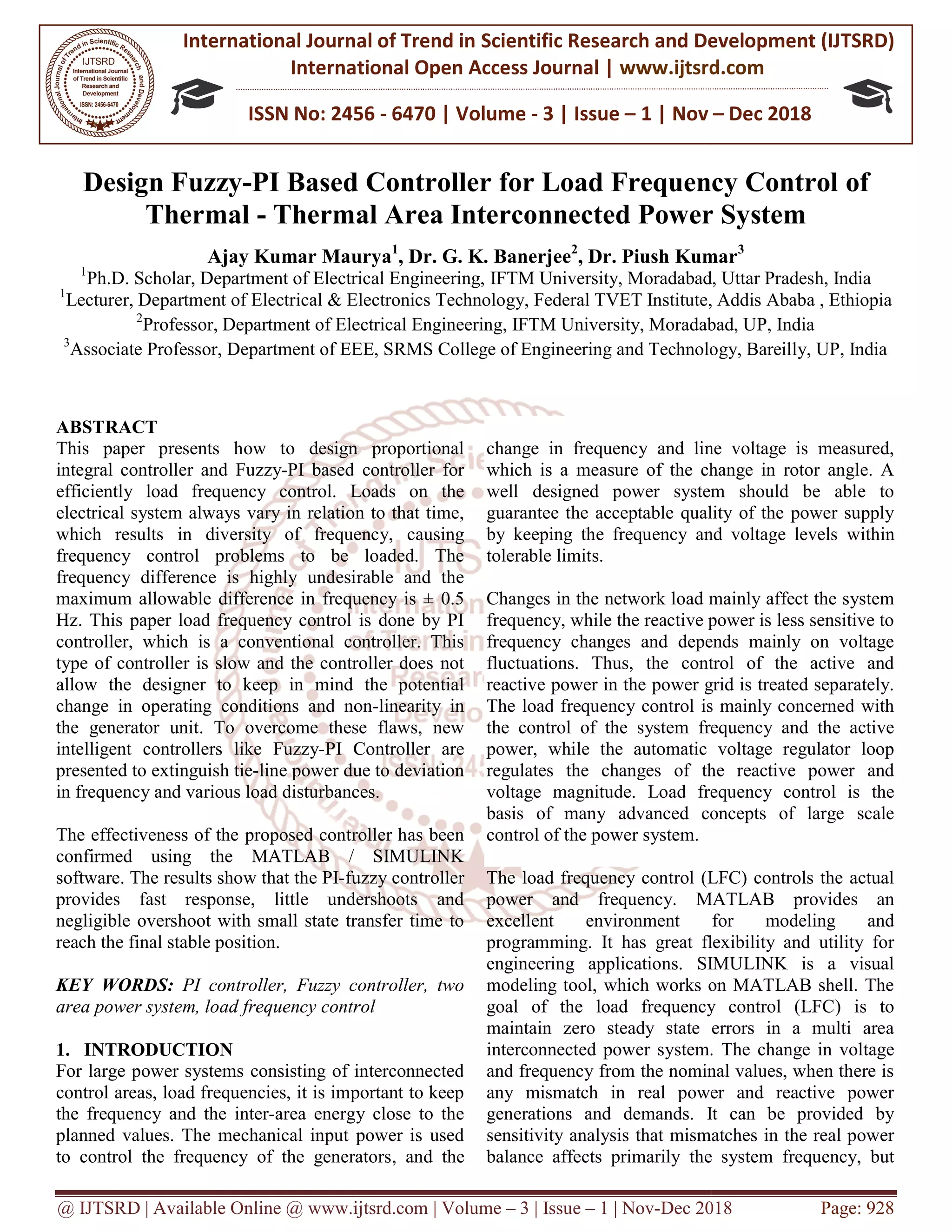 This paper discusses the design of a fuzzy-PID controller for load frequency control in interconnected thermal power systems. It emphasizes the limitations of conventional PID controllers, particularly their slow response to frequency variations, and presents a fuzzy-PID controller as an improvement, shown to provide faster responses and minimal overshoot. The effectiveness of the proposed controller is validated through simulations in MATLAB/Simulink, demonstrating its capability to maintain frequency within acceptable limits despite load changes.