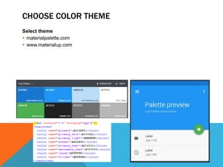Tài liệu hướng dẫn thiết kế giao diện di động với các nguyên tắc về màu sắc, bố cục và kiểu chữ. Người dùng được khuyên chọn một màu chính và một màu hỗ trợ từ vòng tròn màu sắc, cũng như sử dụng các mẫu giao diện khác nhau như grids và cards. Các yếu tố giao diện như nút, hộp thoại và kiểu chữ Roboto được đề cập để tối ưu hóa trải nghiệm người dùng.