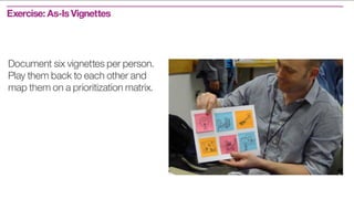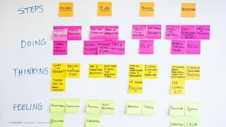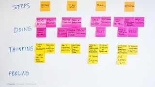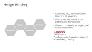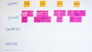 This document describes a design thinking framework and process for developing solutions to problems. It introduces personas for two types of travelers - Tyler, a domestic business traveler, and Blythe, an international vacationer. Their backgrounds, motivations, environments, scenarios, concerns, tasks and pain points are outlined. The framework proceeds through stages of understanding the problem by exploring it with users, defining it with a WHO/WHAT/WOW statement, ideating potential solutions, prototyping ideas, and evaluating them. The goal is to allow users to address their needs in a way that directly benefits them.