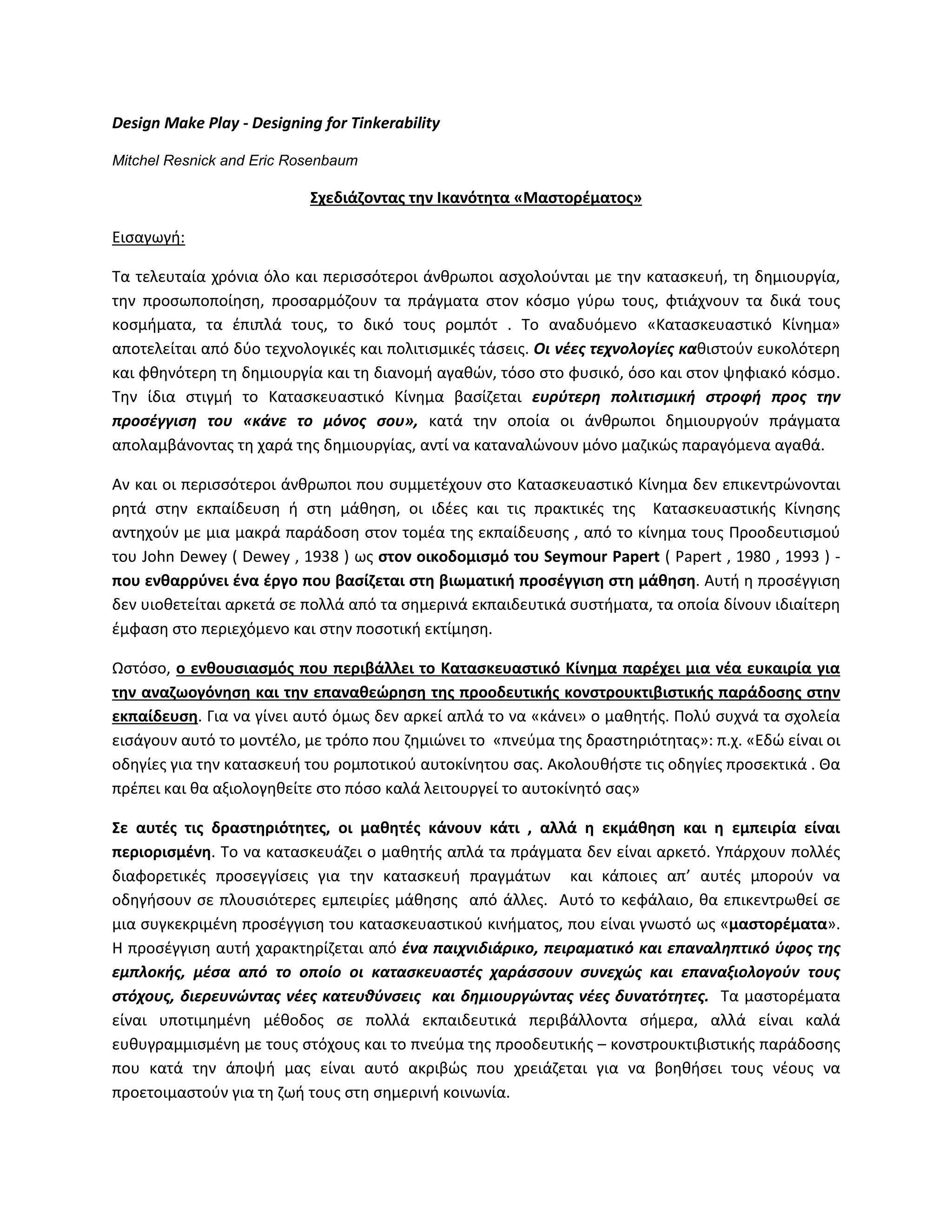 του John Dewey ( Dewey , 1938 ) ωσ ςτον οικοδομιςμό του Seymour Papert ( Papert , 1980 , 1993 ) -