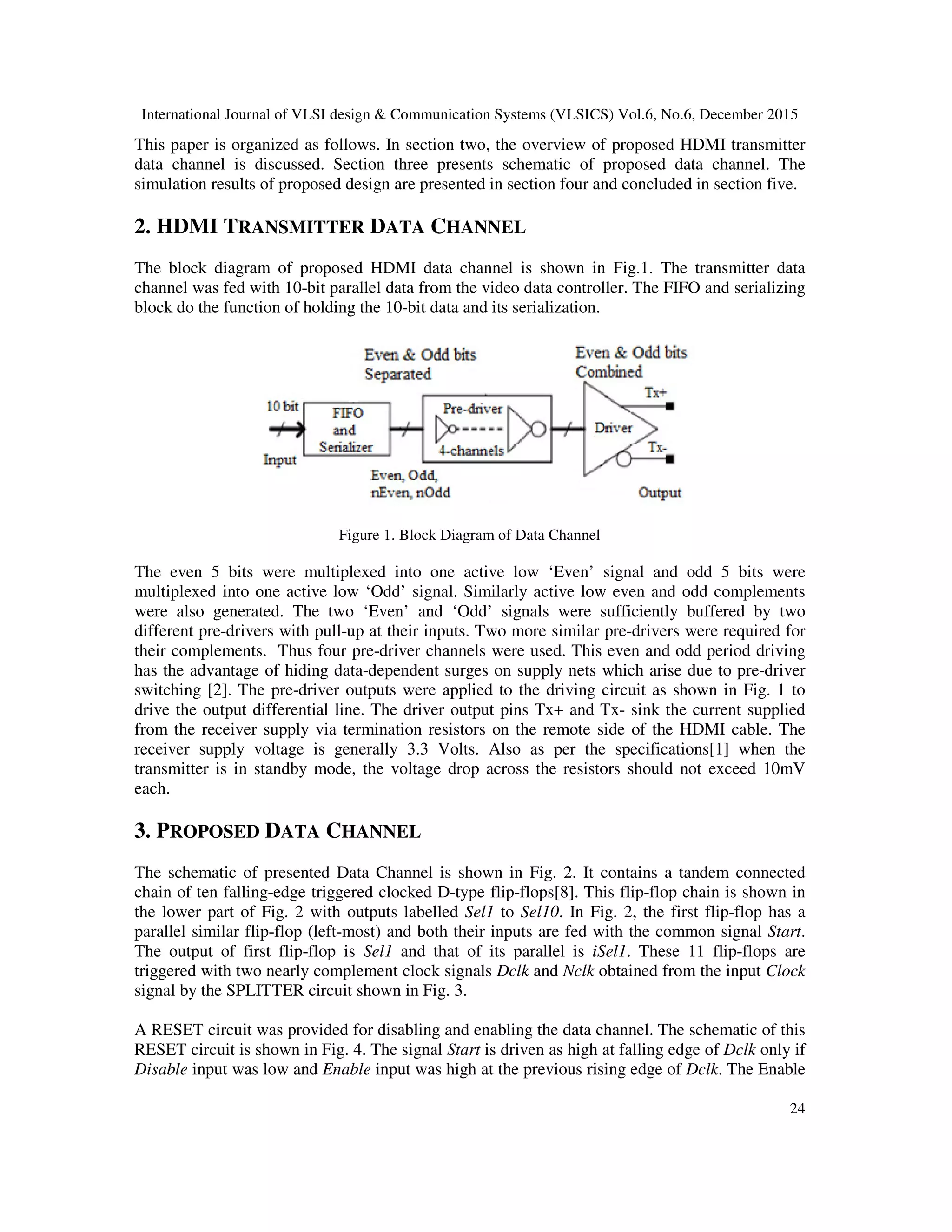 The document discusses the design of a low-power data channel for an HDMI transmitter, operating at a speed of 1.65 Gbps using 180 nm CMOS technology. It employs a single clock input for synchronization and integrates a reset function to manage the data flow efficiently while minimizing power consumption. The design is adaptable for other serial interfaces like USB and LAN with appropriate modifications.