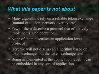 The document discusses a secure token passing protocol implemented at the application level, focusing on its requirements and operational aspects, particularly using UDP datagrams. It emphasizes the importance of ensuring token authenticity, preventing duplication, and maintaining performance stability within a full mesh topology for token circulation. Experimental validation of the protocol demonstrated its effectiveness in both real and simulated environments, confirming its robustness against token loss and network failures.