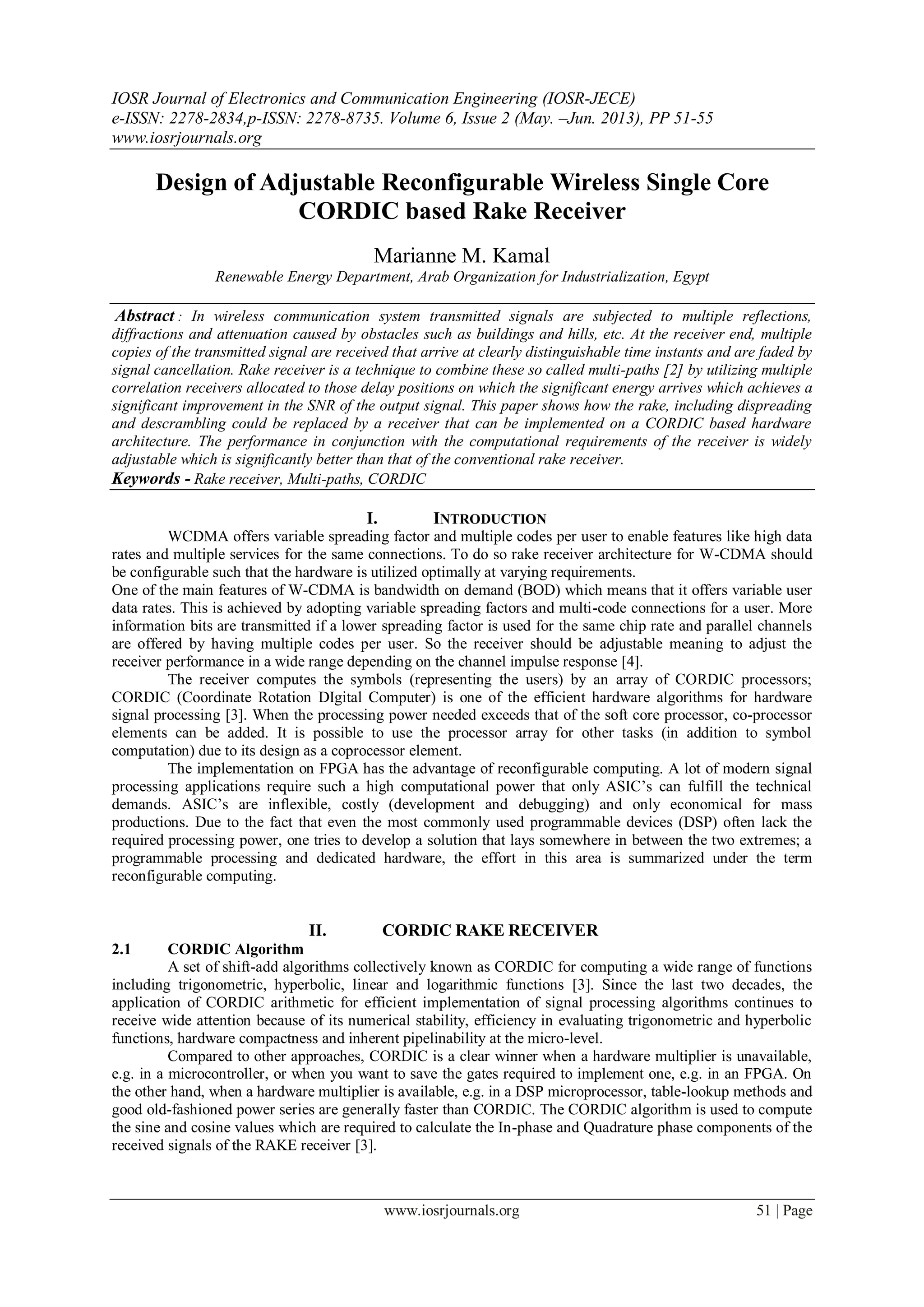 This document presents a study on a reconfigurable wireless single core CORDIC-based Rake receiver for wireless communication, focusing on improving signal-to-noise ratio (SNR) by effectively processing multipath signals. It details the advantages of using CORDIC algorithms for hardware implementation and the receiver's architecture, which allows for optimal resource use under varying data rate requirements. The findings indicate that the proposed receiver architecture outperforms conventional designs in terms of complexity, power consumption, and bit error rate (BER).