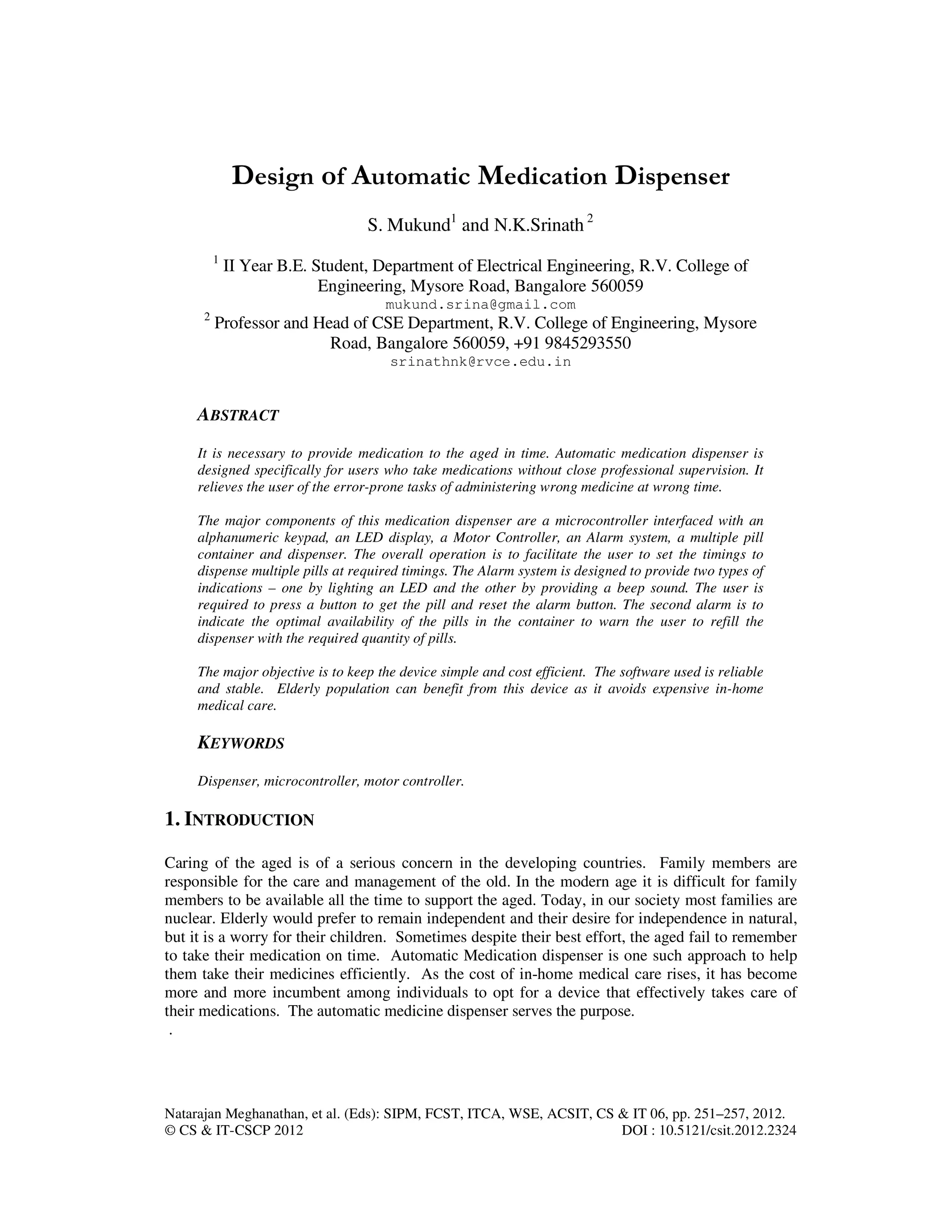 The document presents the design of an automatic medication dispenser aimed at assisting the elderly in taking their medications on time, thereby minimizing the risk of errors. It integrates components such as a microcontroller, keypad, alarm system, and multiple pill containers, allowing users to program medication schedules and receive alerts for both medication times and refill needs. By providing features like audio-visual notifications and user-friendly interfaces, this device addresses the challenges of medication management in an aging population.