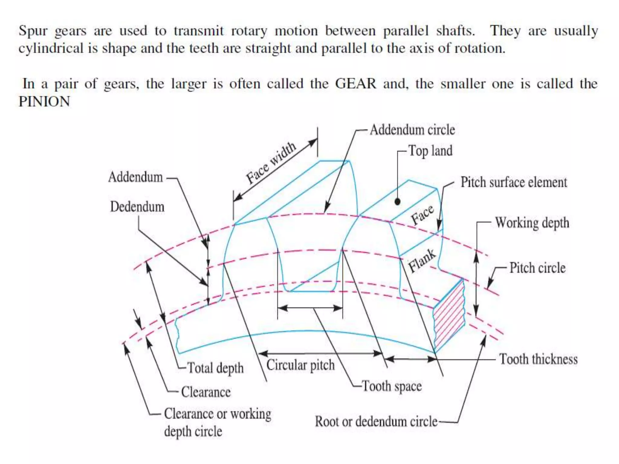 The document provides an extensive overview of gear design, including definitions, classifications, and fundamental principles of gear mechanics. Key topics include types of gears, gear tooth profiles, materials used for manufacturing, design considerations, and failure modes. It highlights the advantages of involute gears over cycloidal gears and outlines the design procedures for spur and helical gears.