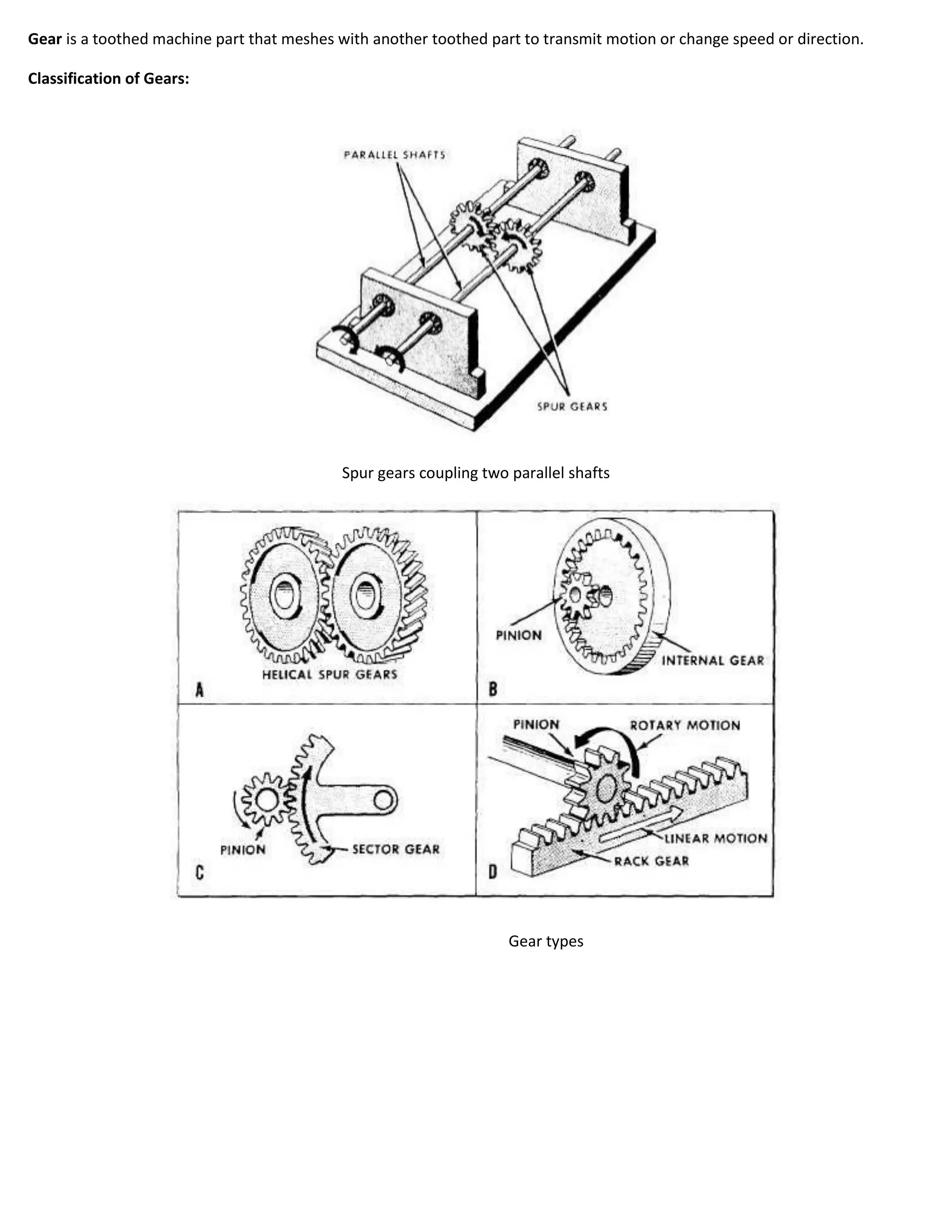 Gears are toothed machine parts that transmit motion between parallel shafts. There are several types of gears including spur gears, helical gears, bevel gears, herringbone gears, and worm gears. The speed ratio of two gears is equal to the number of teeth on the driven gear divided by the number of teeth on the driving gear. Additional key terms described include the pitch circle, addendum circle, dedendum circle, tooth thickness, space width, backlash, pressure angle, and the law governing tooth shape.