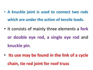 A knuckle joint connects two rods under tensile loads. It consists of a forked or double eye rod, a single eye rod, and a knuckle pin. The joint allows a small angular movement of one rod relative to the other. Applications include elevator chains and valve rods. It fails due to tension on the solid rods, shear on the knuckle pin, tension or shear on the single eye rod end, or crushing of the forked or single eye rod ends. The loosely fitted knuckle pin can also fail due to bending.