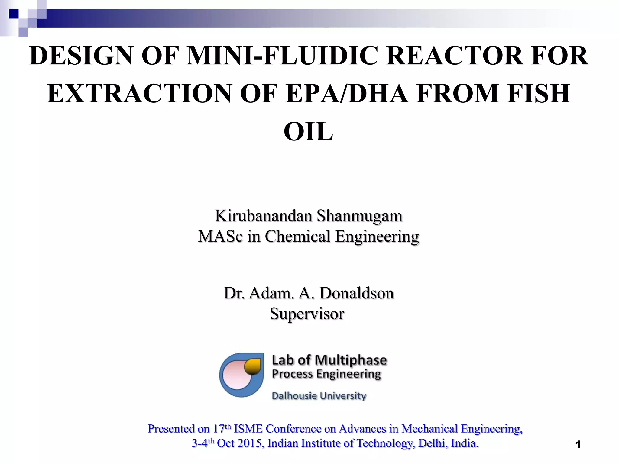 The document describes research on extracting EPA/DHA from fish oil using a mini-fluidic reactor and comparing it to a batch reactor. Key findings include: