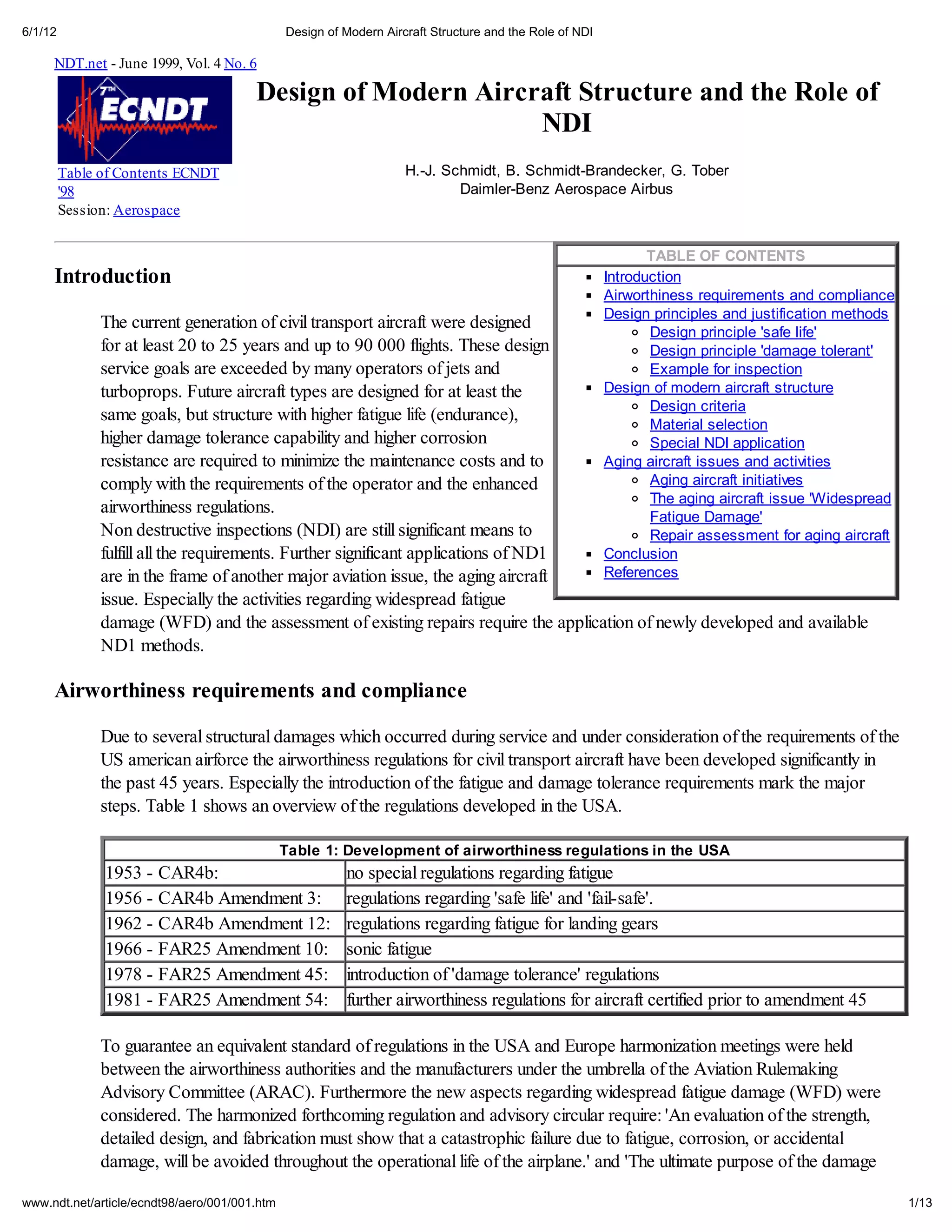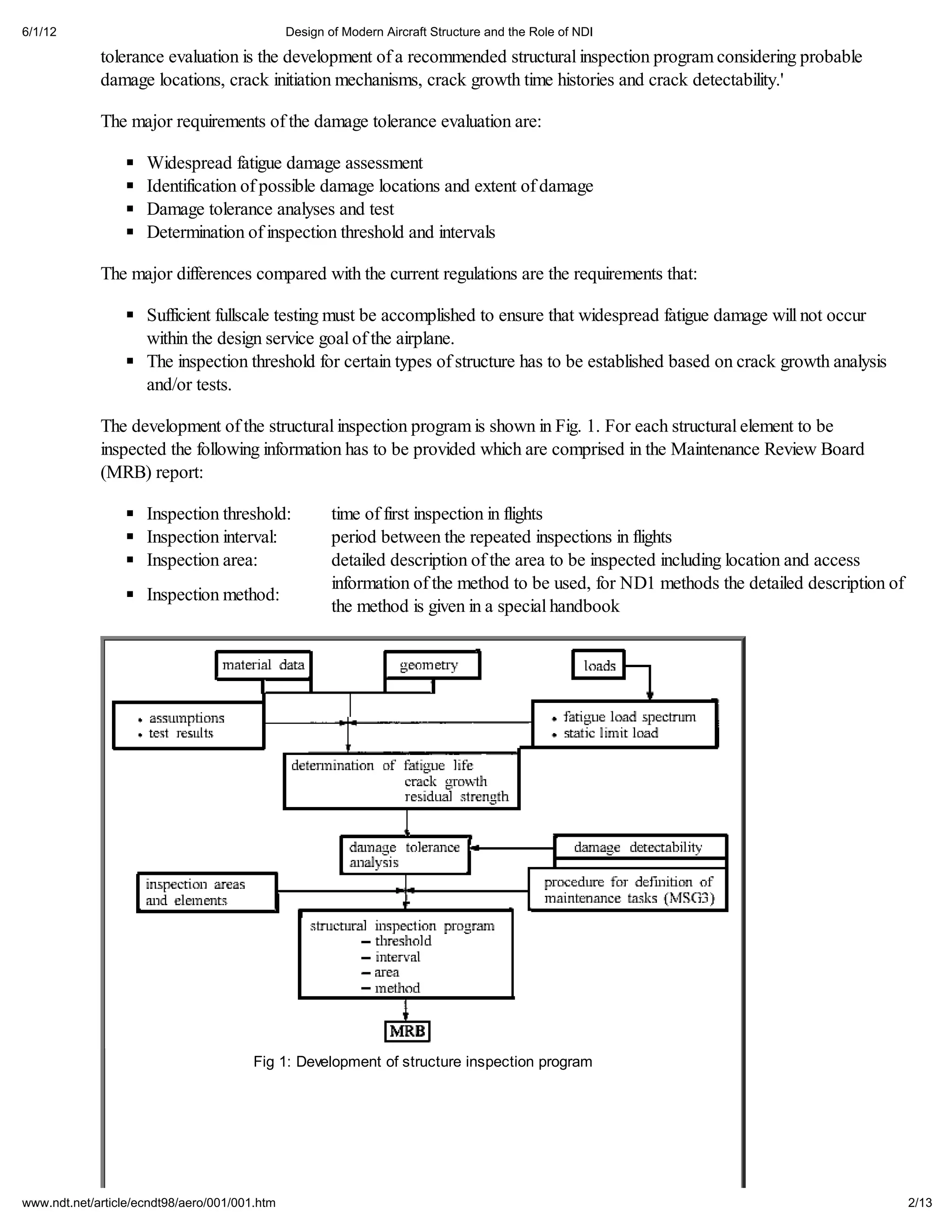 1) The document discusses the design of modern aircraft structure and the role of non-destructive inspection (NDI).