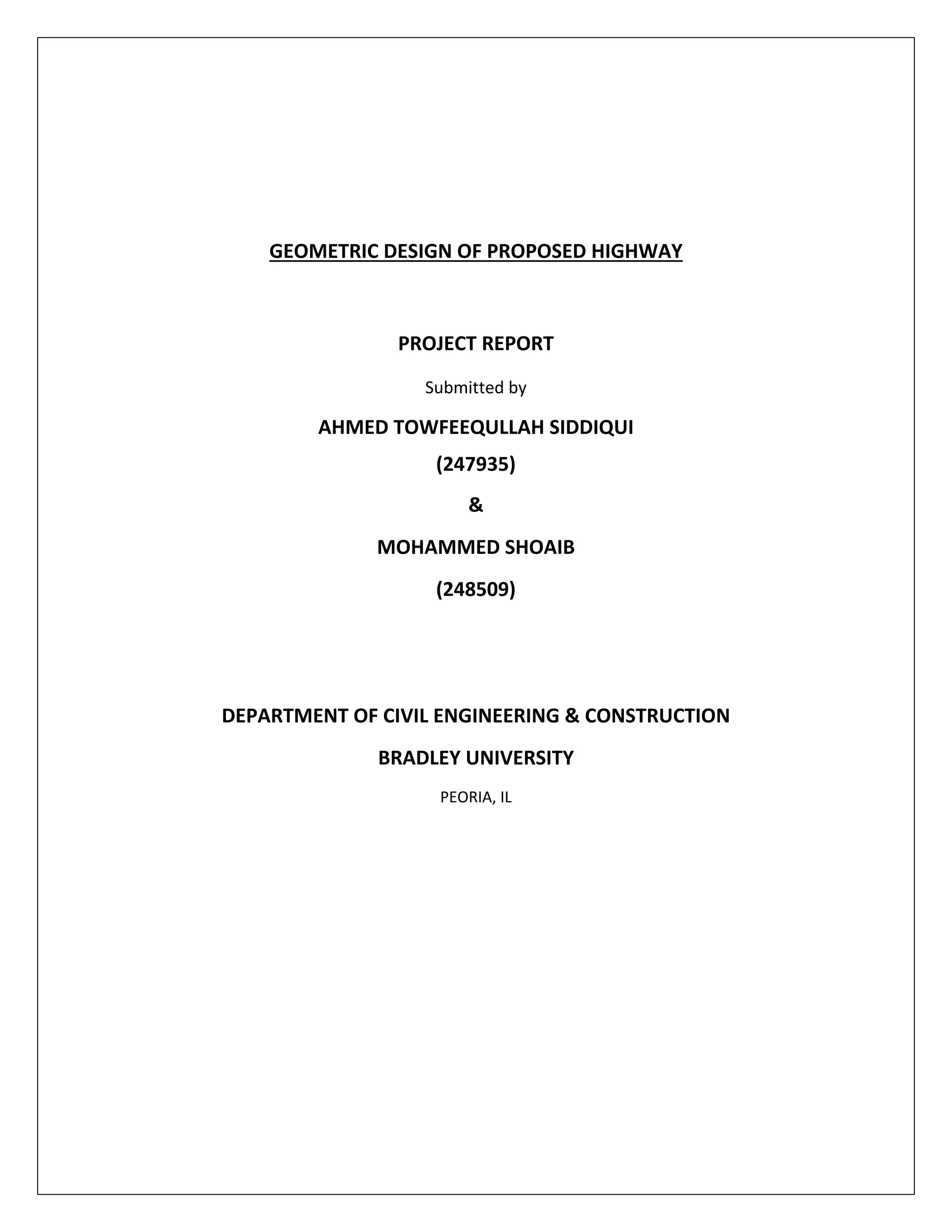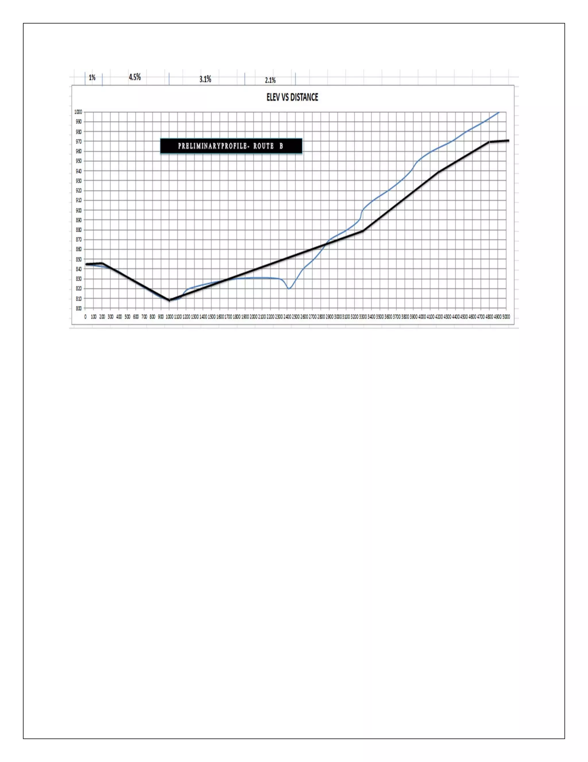 The document outlines the geometric design of a proposed highway project, detailing the evaluation of two alternative routes based on specified criteria such as environmental impact and cost. After analysis, route B was selected for its technical feasibility, while route A was deemed unsuitable due to excessive uphill hauling and other concerns. The report further includes specifications on horizontal and vertical alignments and associated computations necessary for the design process.
