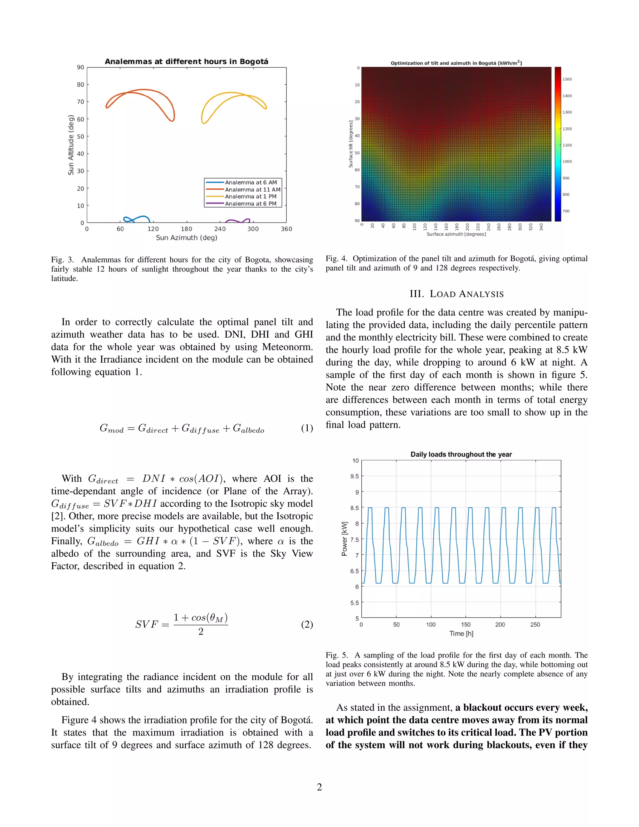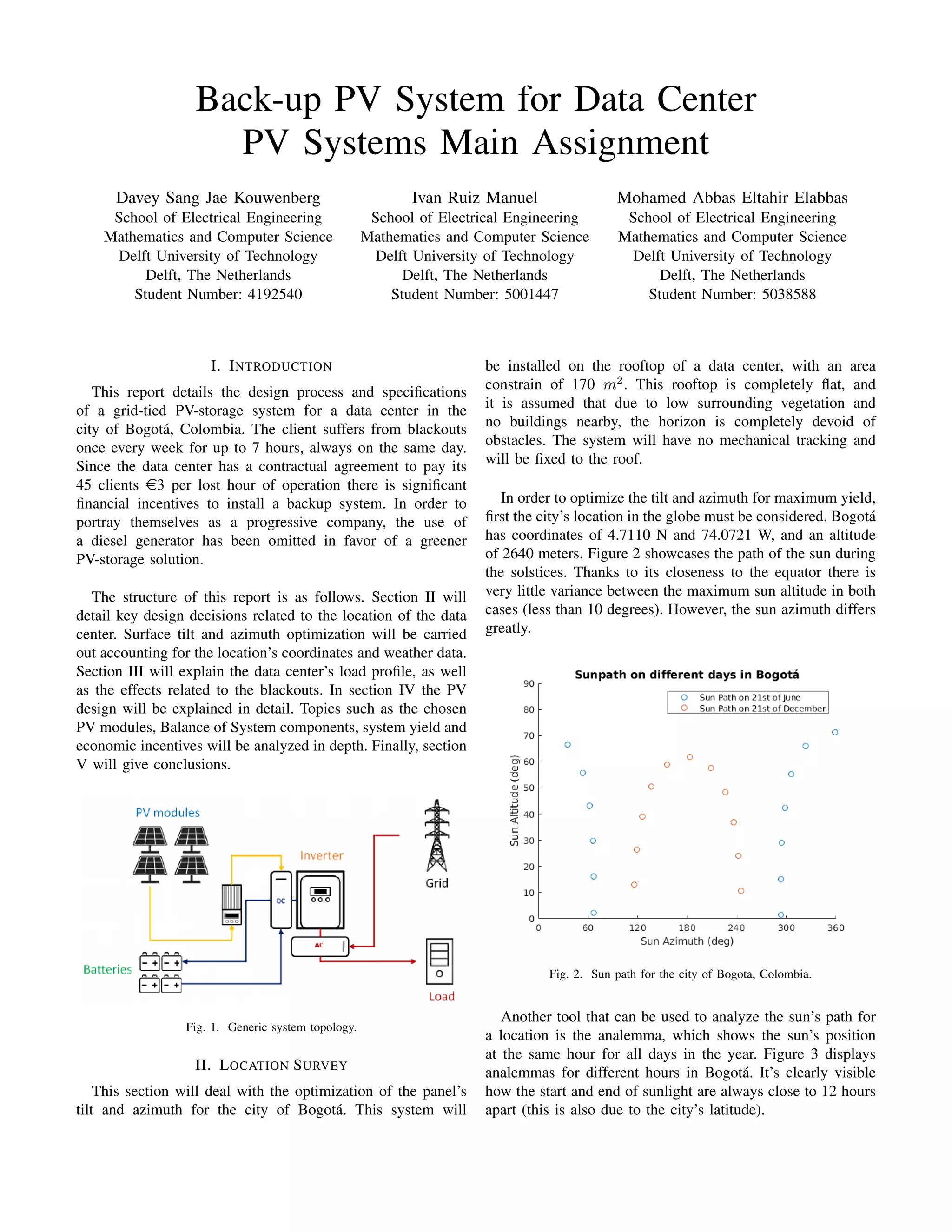 This document details the design of a backup PV system for a data center in Bogota, Colombia. Section I introduces the problem of weekly blackouts at the data center and the financial incentive to install a greener PV-storage backup system instead of a diesel generator. Section II discusses optimizing the panel tilt and azimuth for the location, determining the optimal configuration is 9 degrees tilt and 128 degrees azimuth. Section III analyzes the data center's load profile and effects of blackouts. Section IV provides details on selecting and sizing PV modules, charge controllers, batteries and inverters to meet the load requirements within constraints of the components.