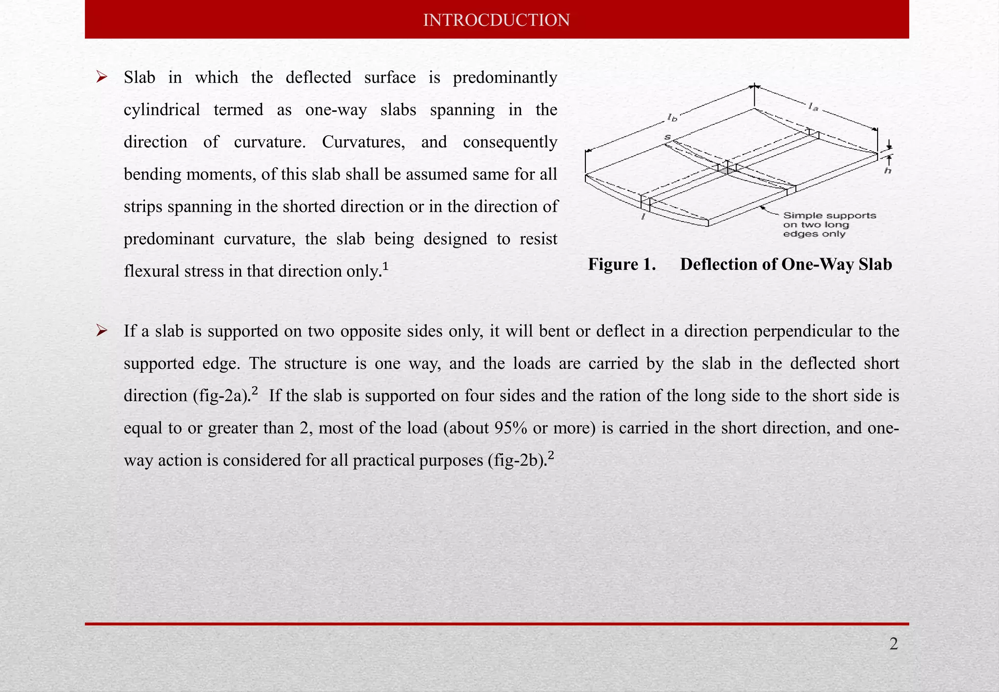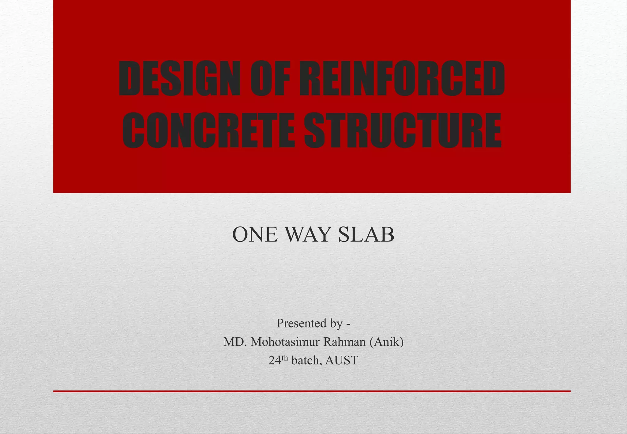 This document provides details on the design of a continuous one-way reinforced concrete slab. It includes minimum thickness requirements, equations for calculating moments and shear, maximum reinforcement ratios, and minimum reinforcement ratios. An example is then provided to demonstrate the design process. The slab is designed to have a thickness of 6 inches with 0.39 in2/ft of tension reinforcement in the negative moment region and 0.33 in2/ft in the positive moment region.