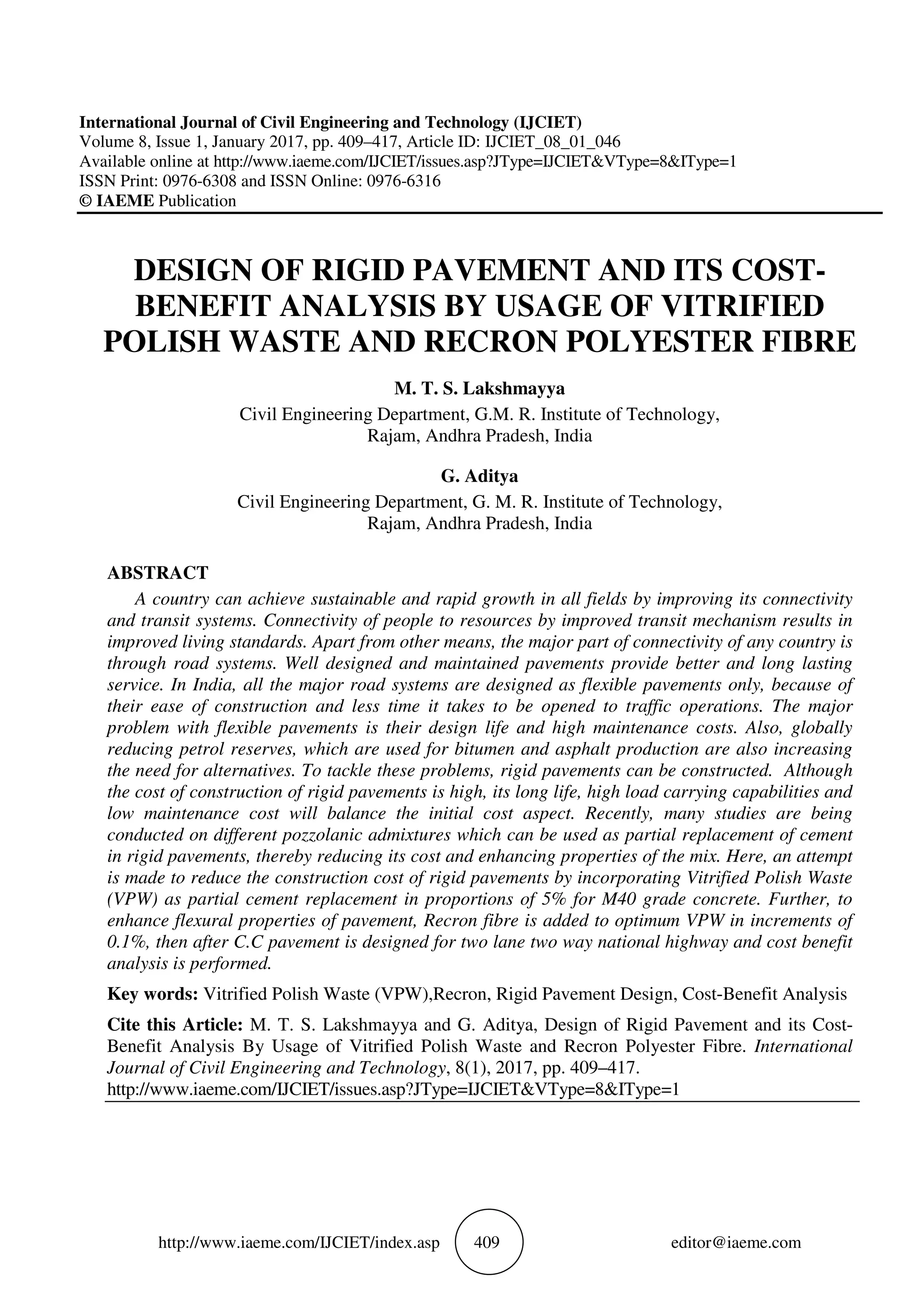 The document discusses the design and cost-benefit analysis of rigid pavements using vitrified polish waste (VPW) and Recron polyester fiber as a partial cement replacement. It highlights the advantages of rigid pavements such as lower maintenance costs and longer lifespan compared to flexible pavements, which dominate India's road systems. The study concludes with findings on mechanical properties and suggests optimal combinations for improving concrete strength and reducing construction costs.