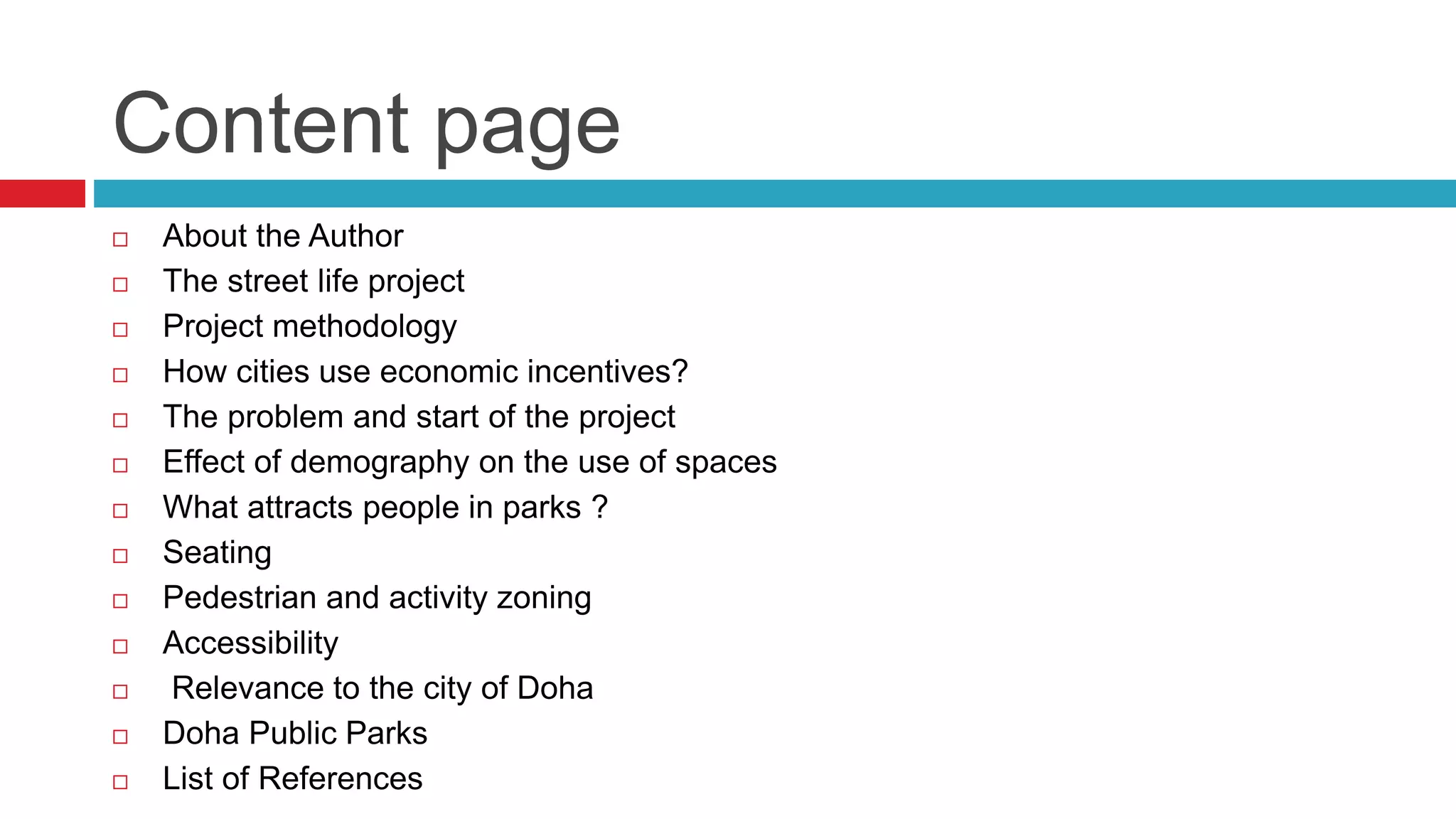 The document discusses the design of urban spaces, primarily through the lens of William W. Whyte's Street Life Project, which focused on pedestrian behavior in urban settings. It outlines project methodologies and findings related to space usage, seating, accessibility, and demographic influences, and references their relevance to public parks in Doha. Key insights include the importance of seating arrangements and urban planning incentives to enhance social interactions in city spaces.