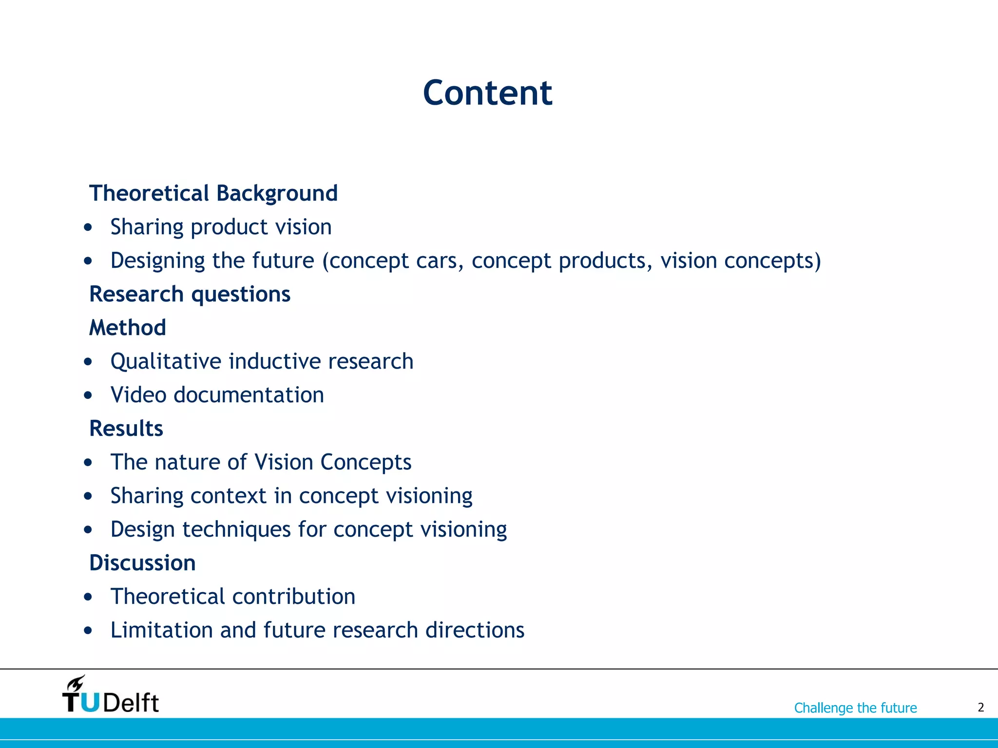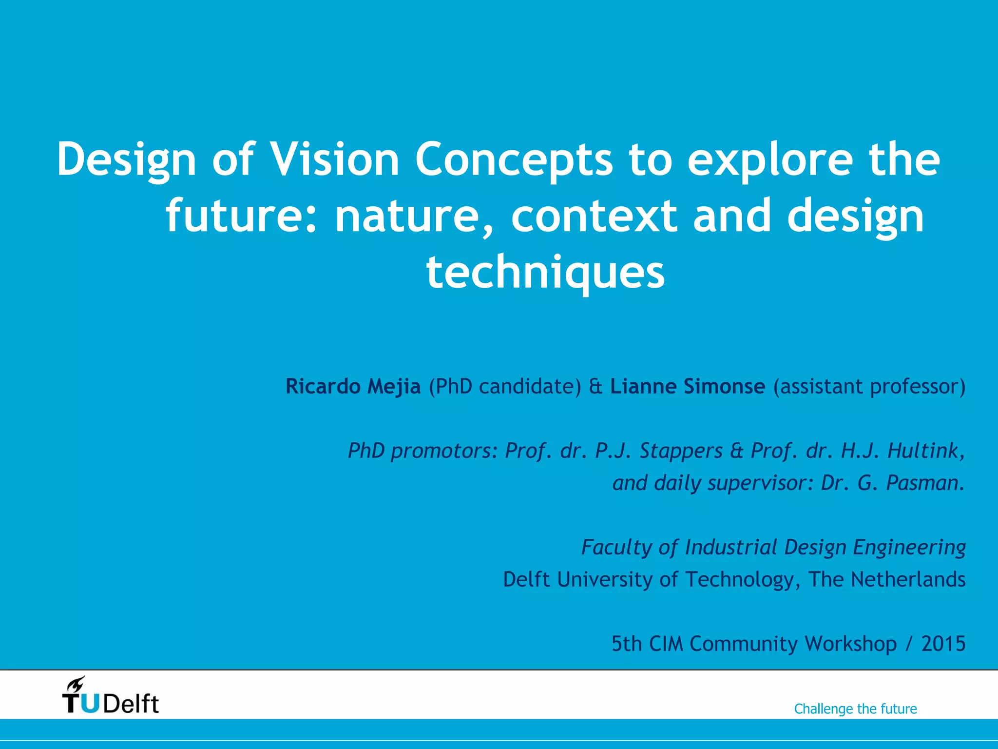 Vision concepts are tangible prototypes used by organizations to explore ideas about the interplay between products and users in future contexts. They represent non-functional or fully working models that demonstrate key features. Examples include concept cars and kitchen concepts presented as vehicles or product systems. Vision concepts are outputs of research exploring questions like how people will interact with food in 2025. They are shared internally through workshops and presentations, and publicly at international events. The design process involves research set-up, future exploration, concept design, prototyping, and developing future messages for exhibition.