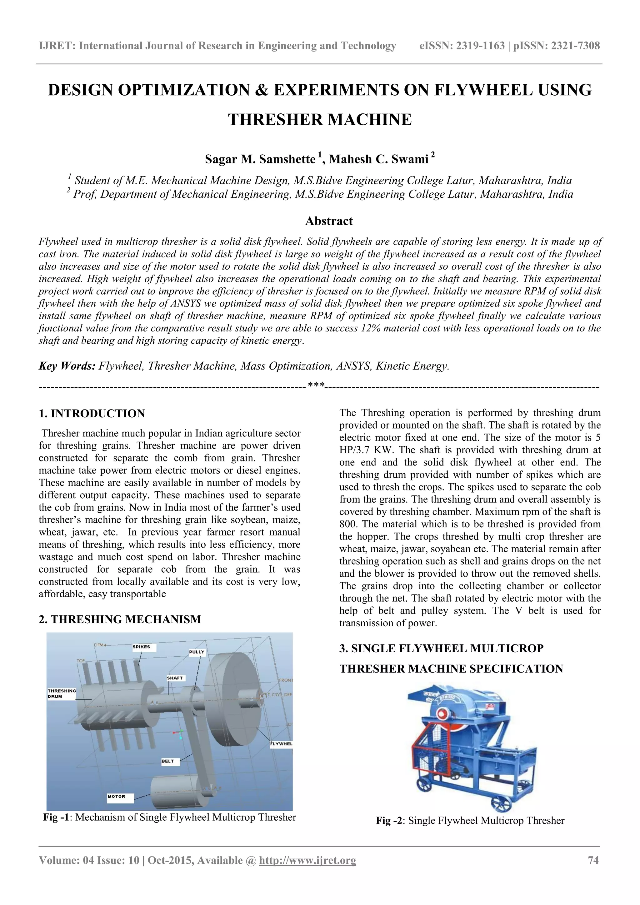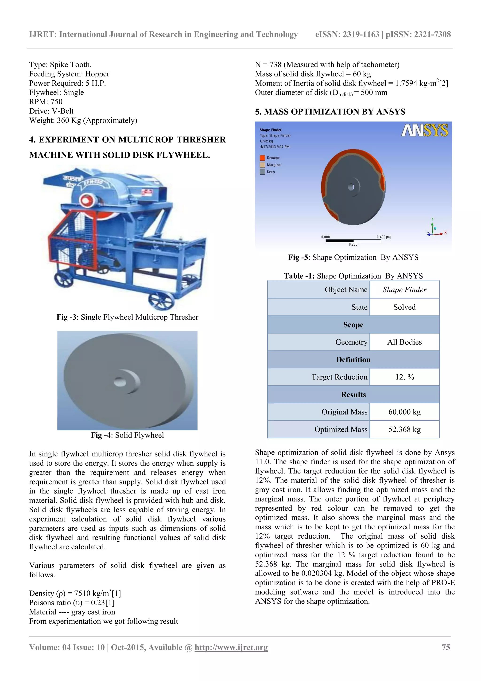 This document presents research focused on optimizing the design of flywheels used in multicrop thresher machines. The study demonstrates a 12% reduction in material costs and improved performance by using an optimized six spoke flywheel compared to a solid disk flywheel, which is limited in energy storage. The results indicate that the new design significantly enhances kinetic energy storage and reduces operational loads on the machine's components.
