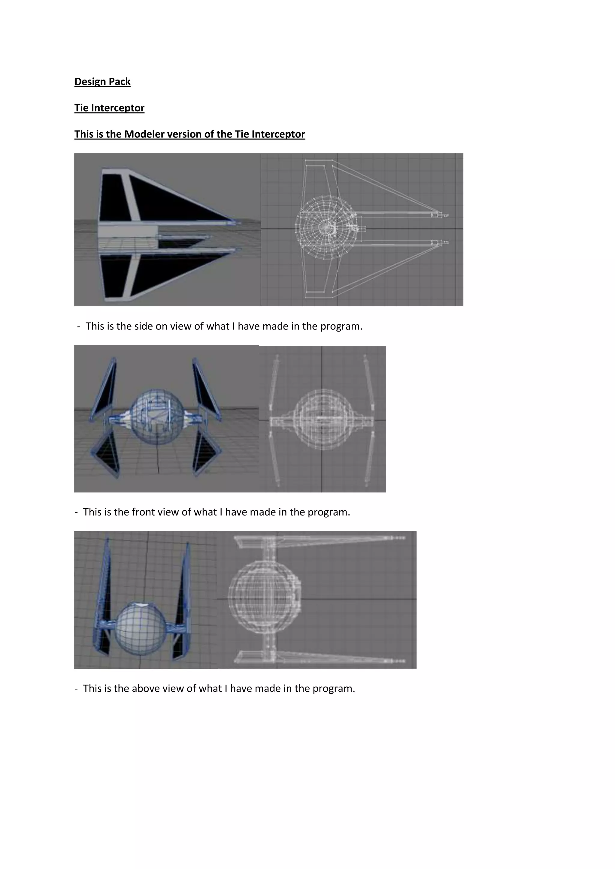 This document contains 3D models and sketches for a TIE Interceptor spacecraft and tunnel system made in a modeling program. It includes side, front, and above views of the TIE Interceptor model as well as an entrance to the tunnel system leading to a weaponry area and tanks, and sketches of the TIE Interceptor views and a curved tunnel system design.