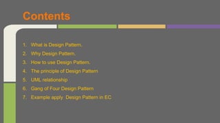 The document provides an overview of design patterns, including what they are, why they are used, how to apply them, examples of common patterns, and an example application to expense reporting. Design patterns solve common programming problems by describing core solutions that can be reused in different situations, with the intent of increasing code reuse and flexibility. The document discusses several fundamental design patterns including creational, structural, and behavioral patterns, provides UML diagrams to illustrate the relationships between pattern participants, and gives a detailed example of how patterns could be applied to validate expense reports against business policies.