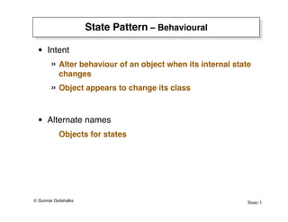 Pattern – Behavioural • Intent » Alter behaviour of an object when its internal state changes » Object appears to change its class • Alternate names Objects for states