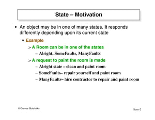 – Motivation • An object may be in one of many states. It responds differently depending upon its current state » Example > A Room can be in one of the states – Alright, SomeFaults, ManyFaults > A request to paint the room is made – Alright state – clean and paint room – SomeFaults– repair yourself and paint room – ManyFaults– hire contractor to repair and paint room