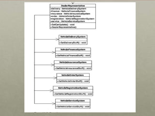 The document outlines several structural design patterns including Adapter, Bridge, Composite, Decorator, Façade, Proxy, and Flyweight. It provides descriptions of what each pattern is, where it would be used, why it would be used, and how it works at a high level. For example, it states that the Adapter pattern enables a noncompliant interface to be used through an intermediary that manages an adaptation process to effect compliance. It is used when needing to integrate with a noncompliant interface or leverage another design's functionality. An intermediary class maps the desired functionality to the required target.