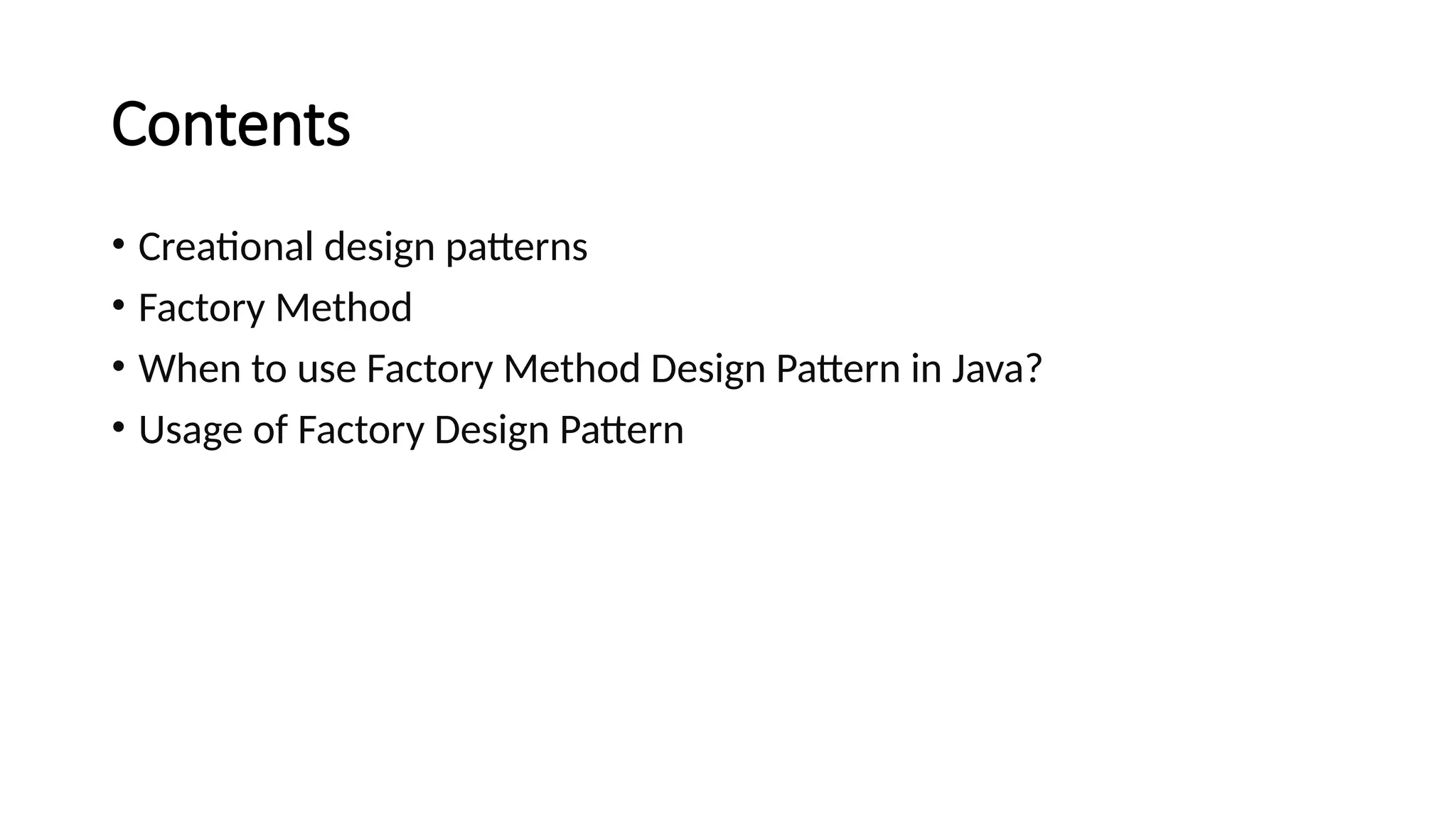 • Factory patternis one of the most used design patterns in Java. This