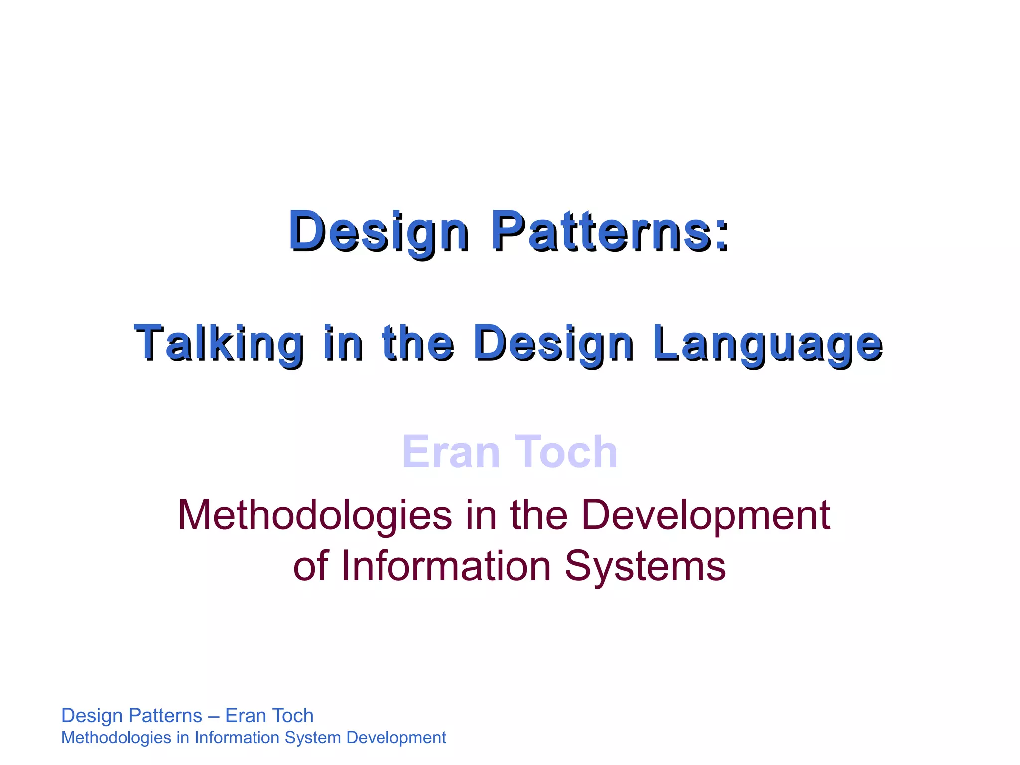 The document discusses various design patterns, including structural patterns like the Composite pattern and behavioral patterns like the Strategy pattern. It provides examples of each pattern, explaining their structure, applicability, and consequences. It also covers the Singleton creational pattern and human interaction patterns such as "Go Back to a Safe Place". The document is intended to teach about design patterns and how they can be used to solve common programming problems.