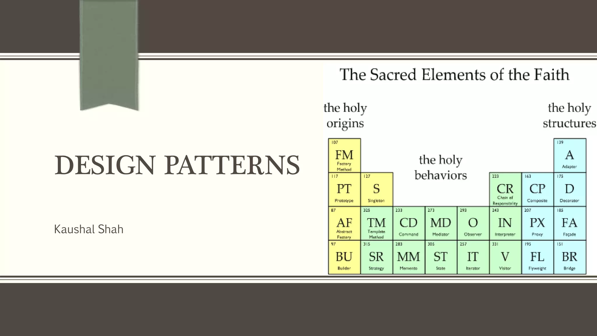 This document discusses design patterns and the singleton pattern. It provides an overview of what design patterns are, the different types of design patterns (creational, behavioral, structural), and how design patterns provide solutions to common programming problems. It then focuses on the singleton pattern, explaining that it ensures a class only has one instance and provides a global access point. The document discusses different implementations of the singleton pattern and considerations around thread safety and lazy initialization. It provides examples of when and where the singleton pattern should be used, such as for shared application data or expensive resources.