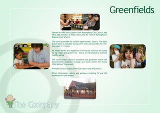 Greenfields, established in 1990 with support from various organizations, serves children aged 6 weeks to 11 years in Nottingham as part of a regeneration scheme. The nursery emphasizes healthy vegetarian meals and meets government daycare standards while offering educational courses and job seeker workshops. The brand is associated with the 'Every Child Matters' framework and features a distinctive logo used primarily on their website.
