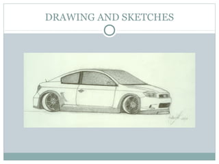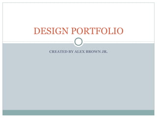 This document is a design portfolio belonging to Alex Brown Jr. that showcases various drawings and sketches he has created. It includes pencil drawings of characters like Betty Boop as well as vehicles. It also shows 3D models and engineering drawings Alex created for school projects involving parts like a motorcycle head gasket, link assembly, and tractor piston. The portfolio demonstrates Alex's skills in techniques like perspective, shading, modeling in Autodesk Inventor, and rendering concepts for products.
